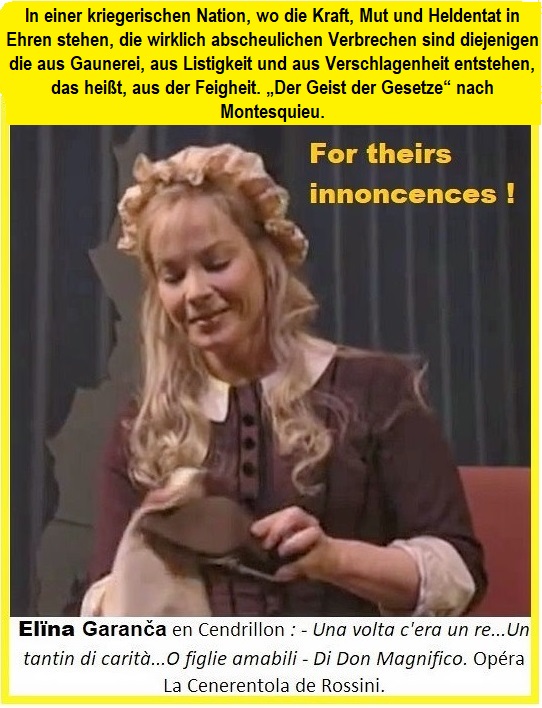 Es bleibt auch noch geheimnisvoll mit welchen Mitteln der Geheimdienst de Armee es fertiggebracht hatte, dass die Sturmgewehre und Handgranaten, die für das Massaker meiner entzückenden Fee Elina Garanča bestimmt waren, von der Polizei von München in Deutschland in beschlagnahme genommen wurden, wo Sie am 2016 und 2017 an der Oper singen wird. Angesichts das was im internationalen Spiel eingesetzt ist, die Oper Werther die Sie am 2016 an der Opéra National de Paris gesungen hatte, stellt das bedeutendste Ereignis dar in der künstlerischen Laufbahn der sublimer Diva Elina Garanča. Für die Abschreckung bin ich absolut verpflichtet kurz kommentieren ihre entzückende Teilnahme mit der BRIEFARIA WERTHER, WERTHER, das Kommentar auf der ganzen Welt auf meinen Websites zu verbreiten um meine entzückende, rettende Göttin vor neuen Mordanschlägen zu bewahren, oder sogar die befürchtete Entführung seiner beiden Töchter durch die Verrückten der Sekten, die man in Fesseln legen müsste. In der internationalen psychologischen Kriegsführung, die auf dem internationalen Schachbrett geführt ist seit Jahrhunderten der Supermächte des Schattens, die zarte und arglose Elina, allein als meine Partnerin, wiegt zu Zeit viel schwerer als die ganze französische Armee an der Parade am Nationalfeiertag des 14 Juli. Glücklicherweise meine sublime, rettende Fee Elina Garanča genießt einen Schutz in Bezug auf ihre strahlende Bedeutsamkeit.