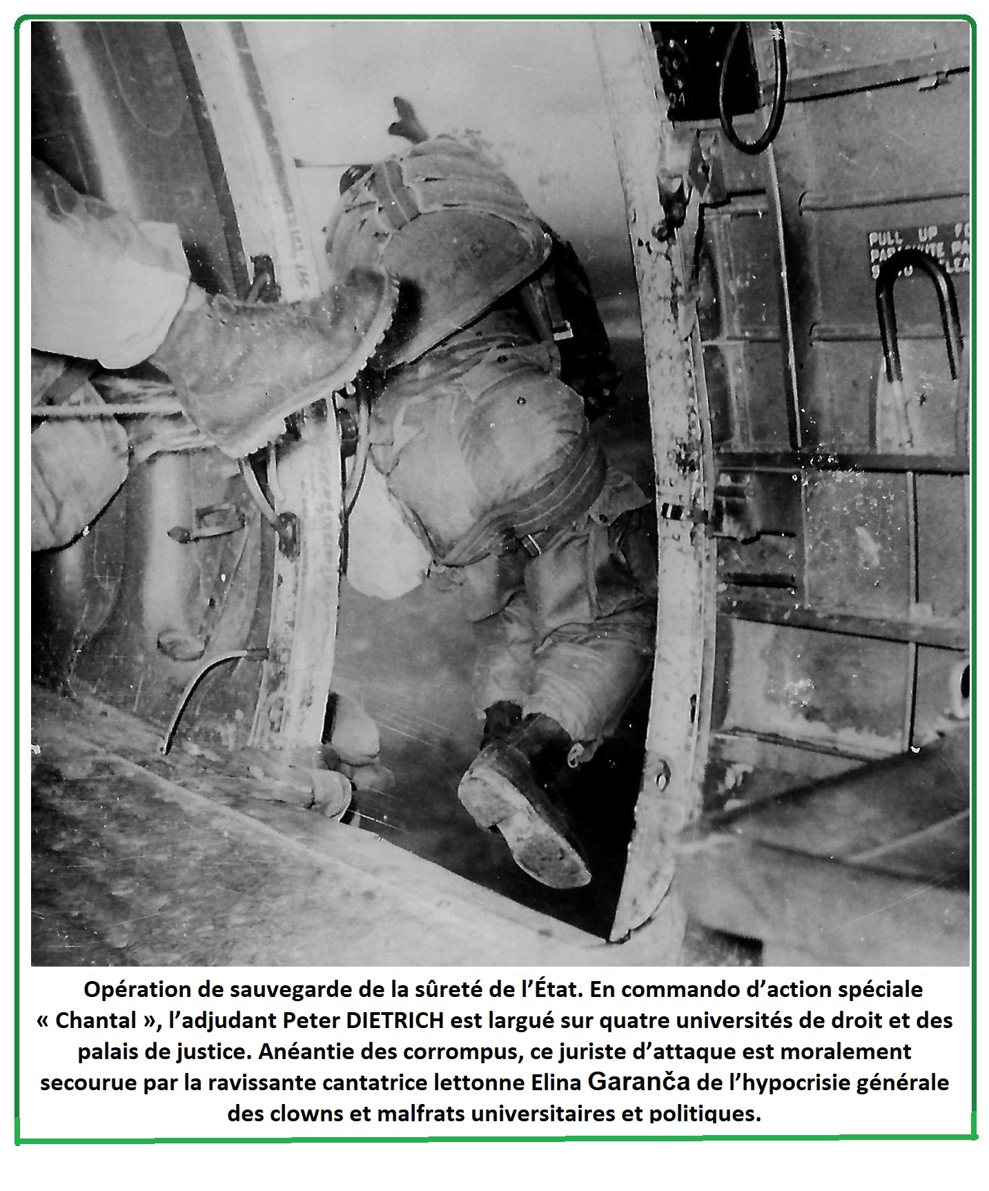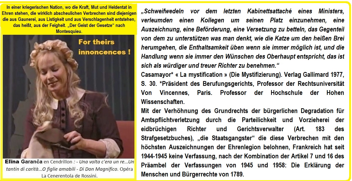 Vous pouvez vous convaincre sur la page intitulée « analyse rétrospective de ma vie depuis la naissance », que vous n’êtes que des lamentables fantoches parmi « les Bouffons de la République » en juges (Arpaillange), car, en raison de mon thème astro-numérologue prophétique, les services secrets de Roger Wybot, chef du DST, m’ont fait chercher en Suisse en 1976 lorsque j’avais juste 18 ans, m’ont fait former à mon insu en « commando d’actions spéciales » pour en juriste qualifié faire rétablir en France la situation légale qui n’existait plus depuis la Libération en 1944-1945. Depuis notre association, le défenseur des droits avec moi, est mon associée salvatrice, la chanteuse d’opéra de la Lettonie Elina Garança, échappée pour vous avoir humiliée au massacre en 1976 à l’opéra national de Paris.