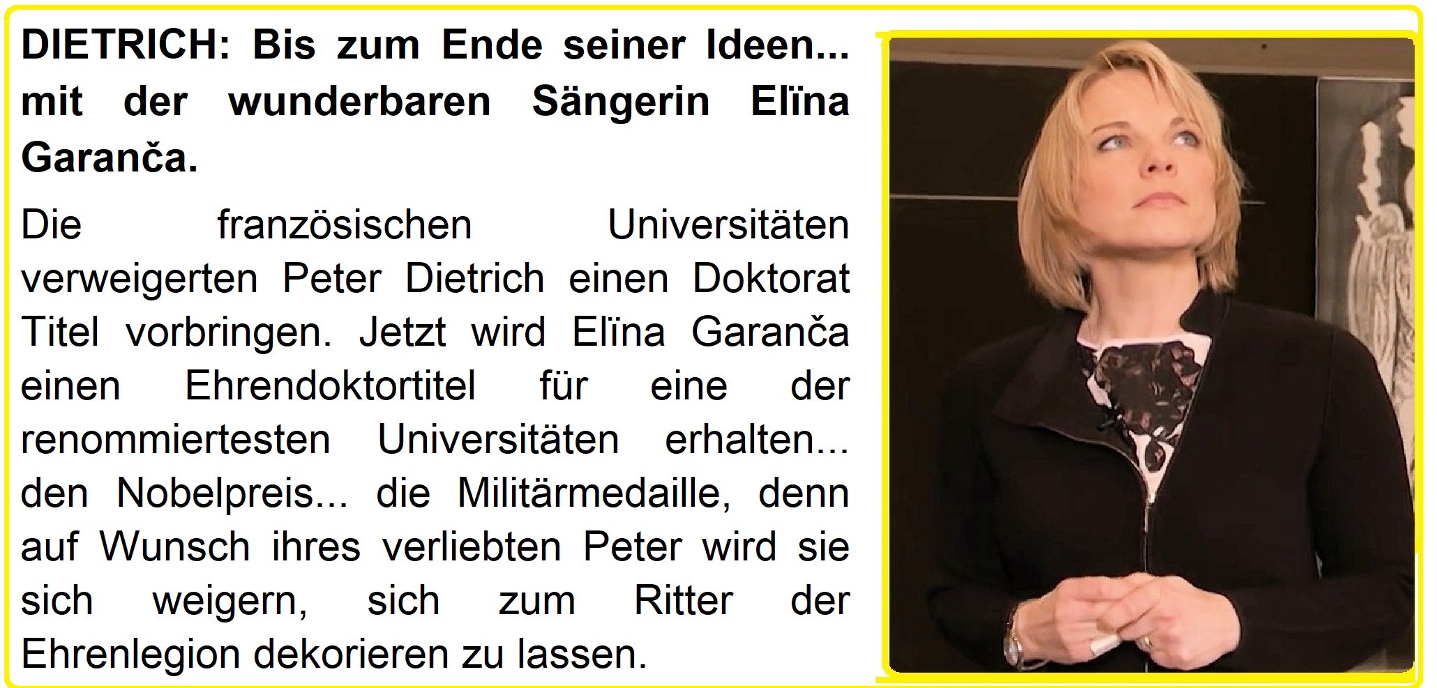 Freitag, 13. Oktober 2017. Zuerst bat ich Mitglieder der Nobelprize.org, meine lebensrettende Vereinigte, die wunderbare lettische Opernsängerin Elina Garanča, für den Friedensnobelpreis vorzuschlagen. Nach genauer Überlegung denke ich, dass es viel sinnvoller sein würde, sie für den Nobelpreis für Gesang und Musik vorzuschlagen und den ehemaligen Präsidenten der Republik François Hollande für den Friedensnobelpreis vorzuschlagen, da er mit dem Ausnahmezustand seine Rettung des Mordes im Versuch des Massacre im Superlativ an der Pariser Staatsoper, Anfang 2016 organisiert hat. Im gerichtlichen und psychologischen Krieg, der sich auf der Weltebene abspielt, die wunderbare Diva Elina Garanca, durch unsere Vereinigung, wiegt viel schwerer als die gesamte französische Armee. Datei veröffentlicht: http://dietrich13.com.