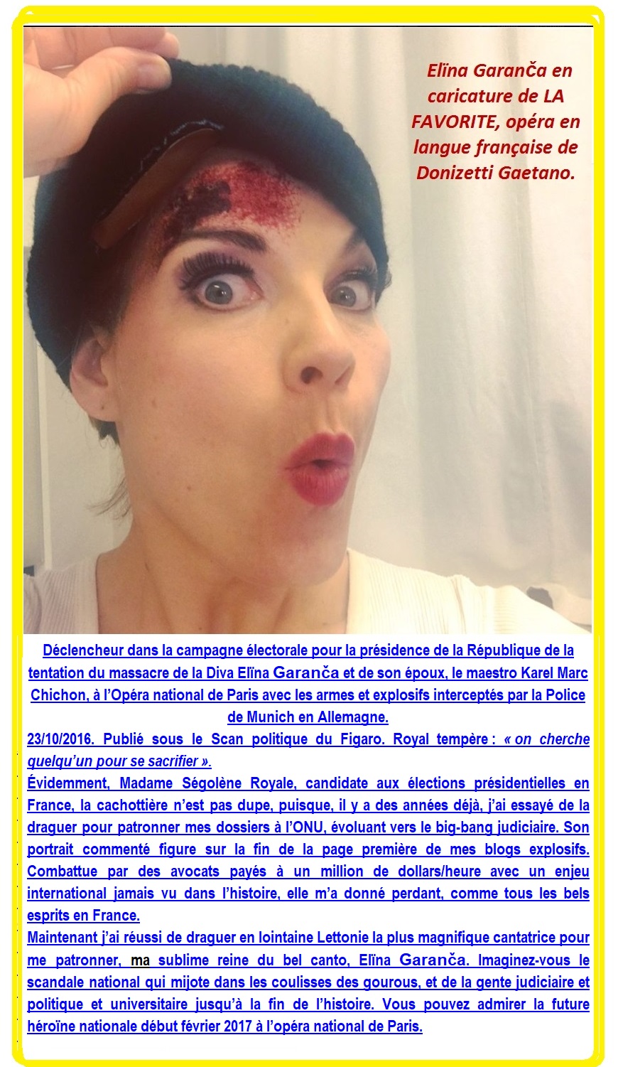 Vendredi 13 octobre 2017. D’abord j’ai demandé à des membres de la Nobelprize.org de proposer mon associée salvatrice, la merveilleuse cantatrice lettonne Elina Garanča, pour le Prix Nobel de la Paix. Réflexion faite, je pense qu’il sera bien plus judicieux de la proposer pour le Prix Nobel du Chant et de la Musique et proposer pour le Prix Nobel de la Paix l’ancien président de la République François Hollande pour avoir organisé dans l’état d’urgence son sauvetage de l’assassinat dans la tentative du massacre au superlatif à l’opéra national de Paris au début 2016. Dans la guerre judiciaire et psychologique se déroulant sur le plan mondial, la merveilleuse cantatrice Elina Garanča, par notre association, pèse plus lourd dans la balance que toute l’armée française.