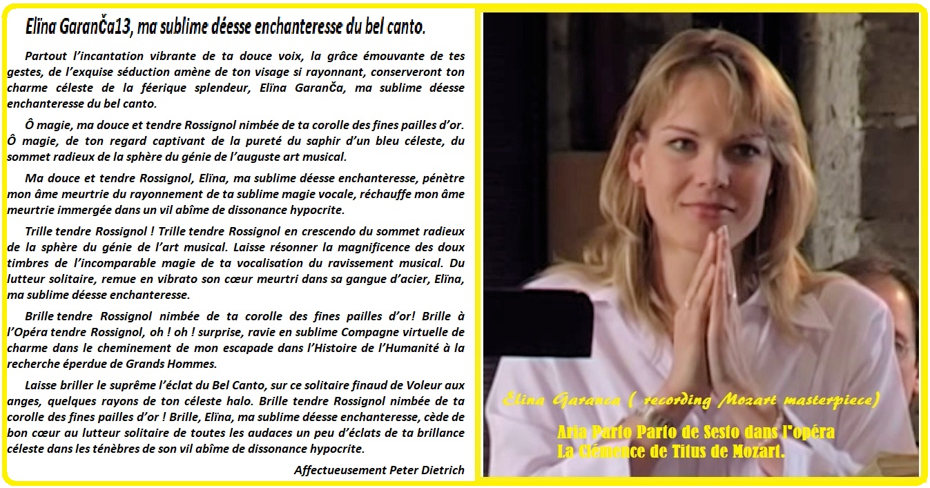 « Ma gracieuse déesse enchanteresse Elina Garanča, dans l’intégrale de son Album BEL CANTO m’offre les plus vives émotions par les merveilleux récitatifs des cantates et arias immortelles, accompagnés des plus illustres étoiles du firmament chantant de l’opéra, embellies par l’orchestration d’une musique chorale et instrumentale des captivantes polyphonies savoureuses. De la diva Elina Garanča, la sublime et fluide voix mezzo-soprano bien meublée dans toute sa large tessiture, du haut cristallin de soprano, ondule ou vibre dans les bas de contralto aux sonorités tendrement veloutées, dans des tempos d’une fascinante souplesse et variations raffinées dans expressivité dramatique, dans les couleurs lyriques. La fascinante beauté de sa virtuosité vocale élevée aux divines splendeurs sonores offre des moments d’intenses émotions, sublimes en solo, en duo ou trio d’une fascinante et poignante sensibilité par la captivante harmonie de la soprano et du ténor et du baryton de grande classe. Peter, le Cavalier de Prose de Elina, émerveillé. »