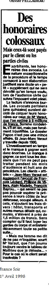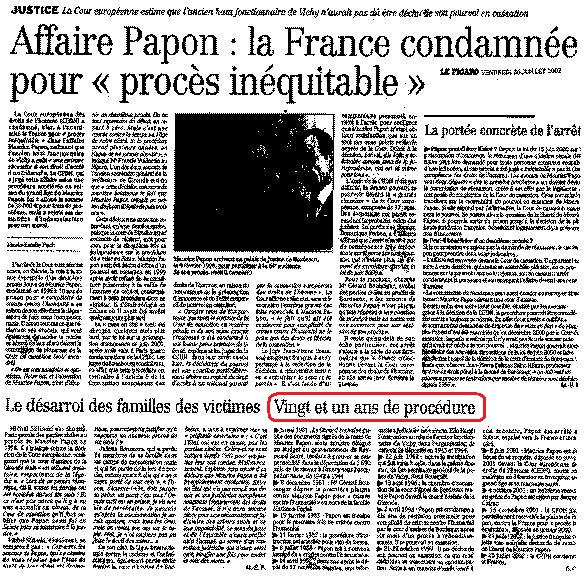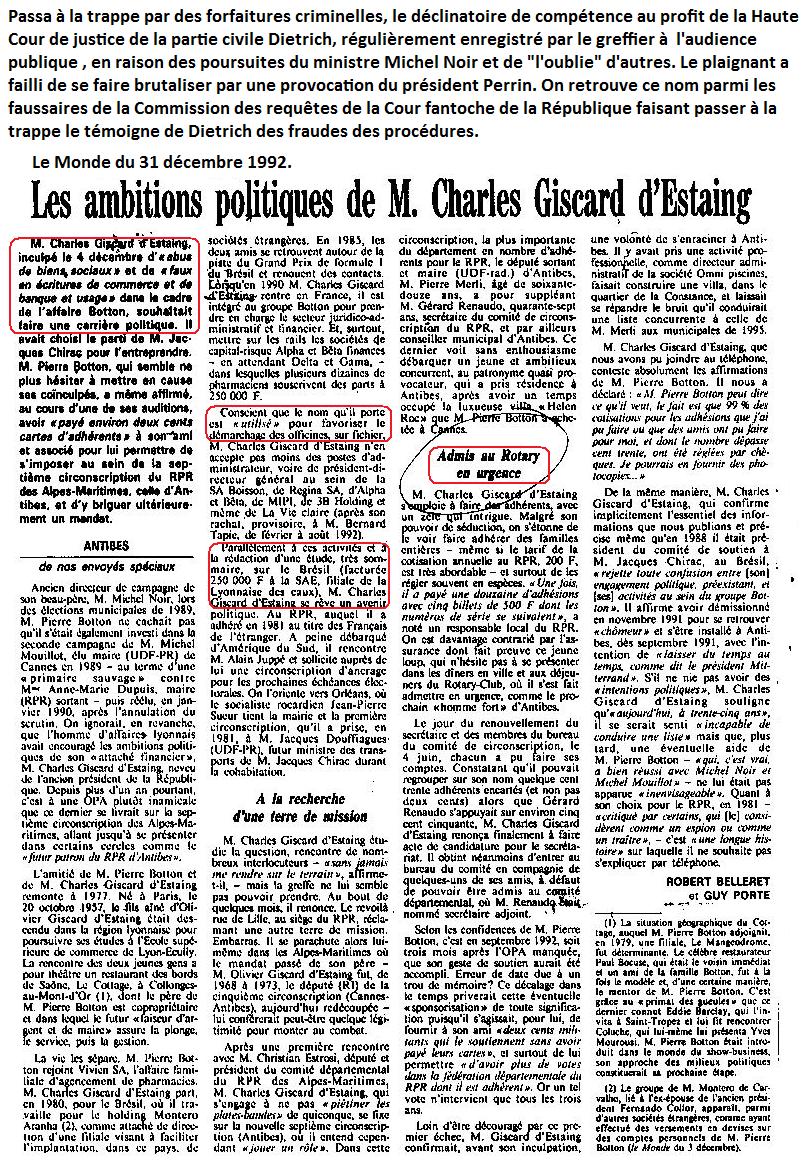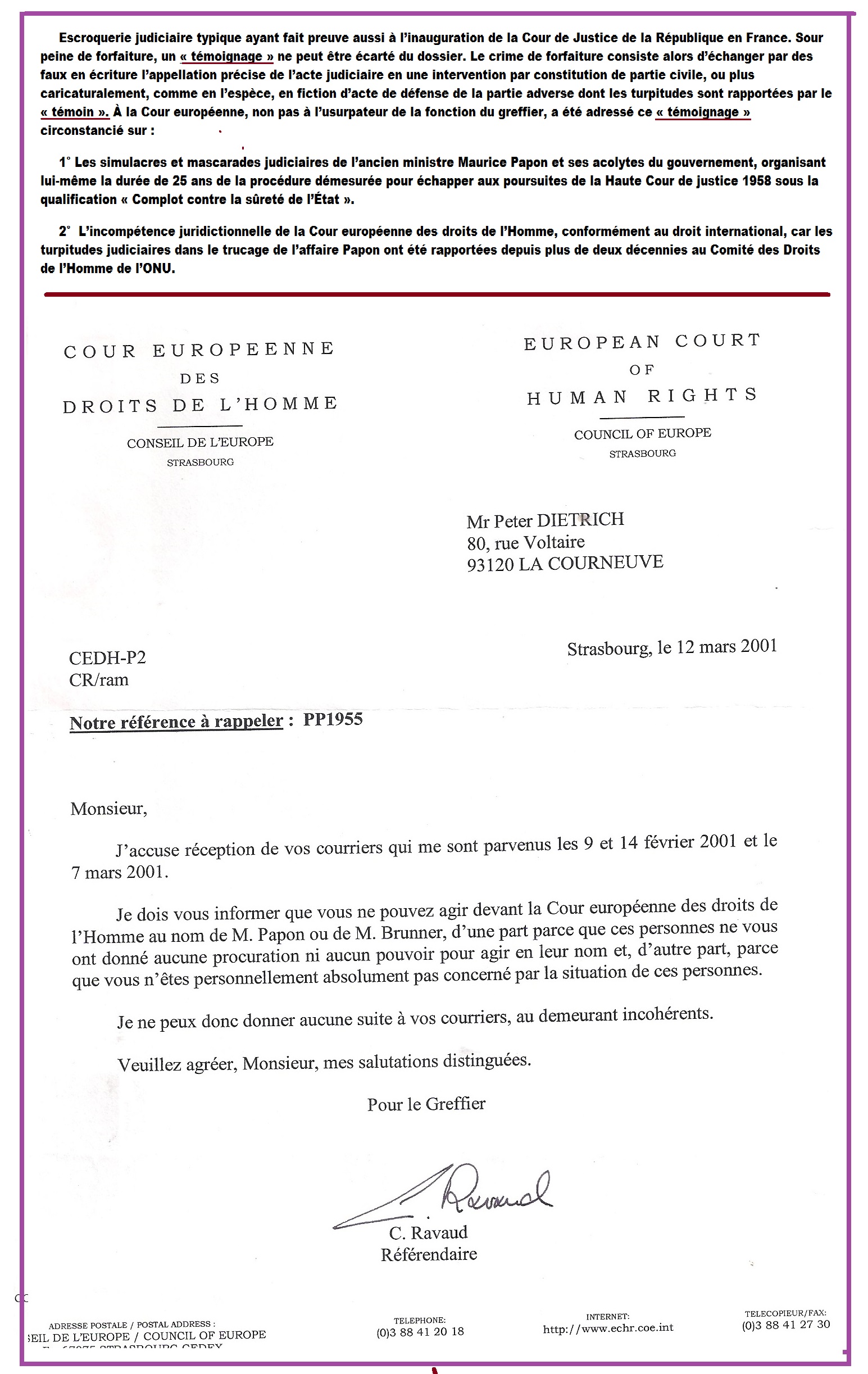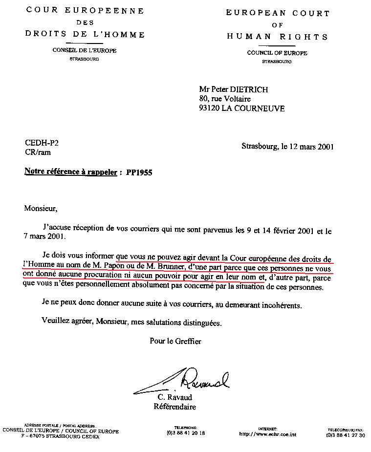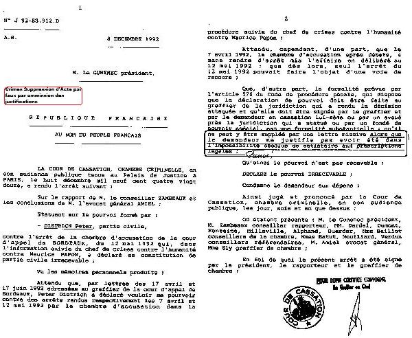 Sous l’impulsion du représentant du gouvernement français à la Coureuropéenne des Droits de l’homme, escroquerie judicaire par la soustraction du dossier Papon du témoignage des fraudes mises en scène par celui-ci avec le ministère public pour éviter la saisine de la Haute Cour de justice menaçant également ses anciens acolytes du gouvernement. Le témoignage des fraudes de Dietrich est travesti en « gestion d’affaire » (sic) de Papon et consorts des crimes contre l’humanité, déclaré irrecevable et éliminé frauduleusement d’une procédure truquée pour l’indemniser sur des fondements montés à tout pièces, des faits organisés avec les procureurs et juges par lui-même et son avocat Me Jean-Marc Varaut, également avocat dans d’autres procédures contre les ministres mafieux proches de Papon, violant la compétence de la Haute Cour de justice.