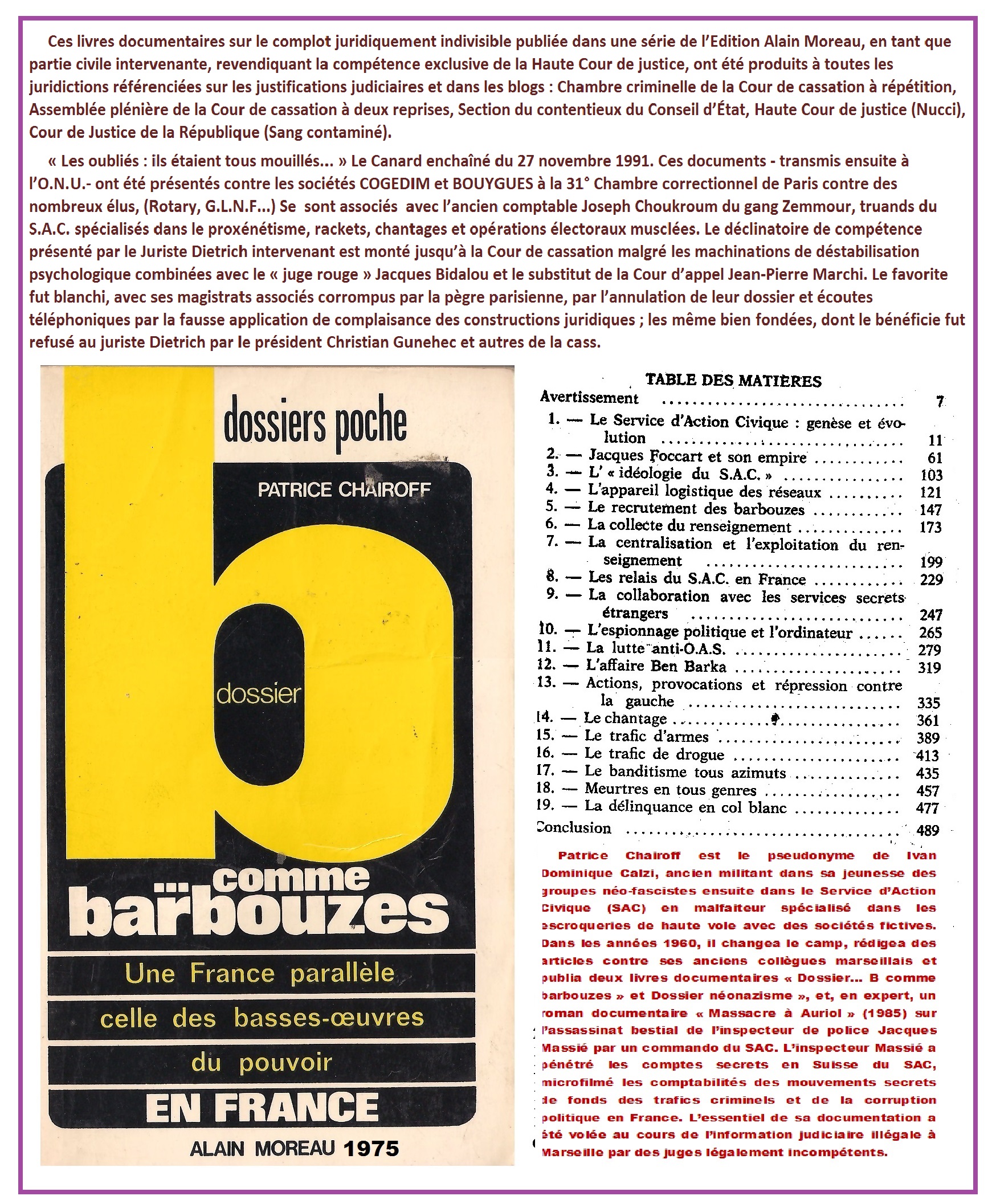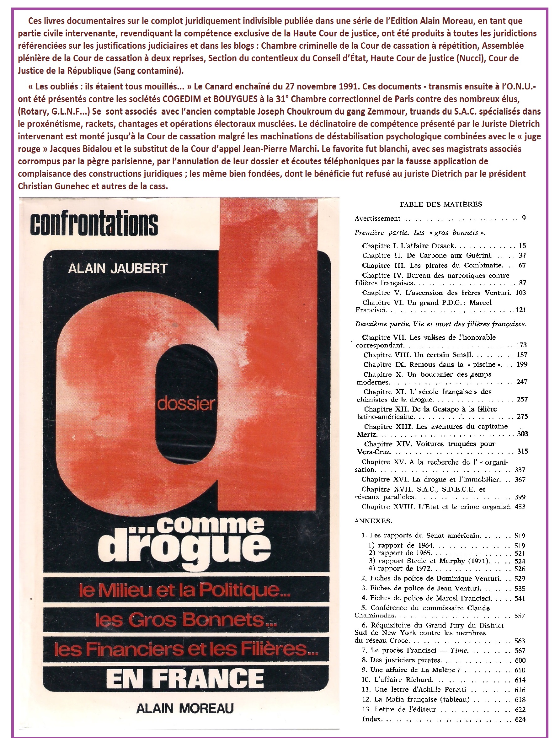 Après mon évasion de la forteresse psychiatrique de Cadillac, près de Bordeaux, en clandestinité, j’avais déjà saisi le Comité des droits de l’homme de l’ONU{2} dans les années 1983, concomitant avec la saisine de l’agriculteur spolié M. Felix Juby. La substitution conventionnelle en 1992 de M. Éric Laborde-Hondet, en mon prête-nom de la saisine de l’ONU, n’a été donc qu’une tactique par laquelle j’ai réussi à contourner, déjouer ma mise officieuse sur la liste noire internationale des plaignants et justiciables dangereux pour les malfaiteurs de la Haute société de la grande finance. Dès mon introduction dans le circuit judiciaire dégénéré en France, « saccagé » selon l’expression des hauts magistrats, j’ai été repéré, fiché et ciblé, (je le suis toujours), par des criminels des trusts secrets des sociétés multinationales corrupteurs, des organisations du grand banditisme du type Mafia, les société secrètes ou aux actions secrètes de leurs dirigeants assassins (blog p. 12).