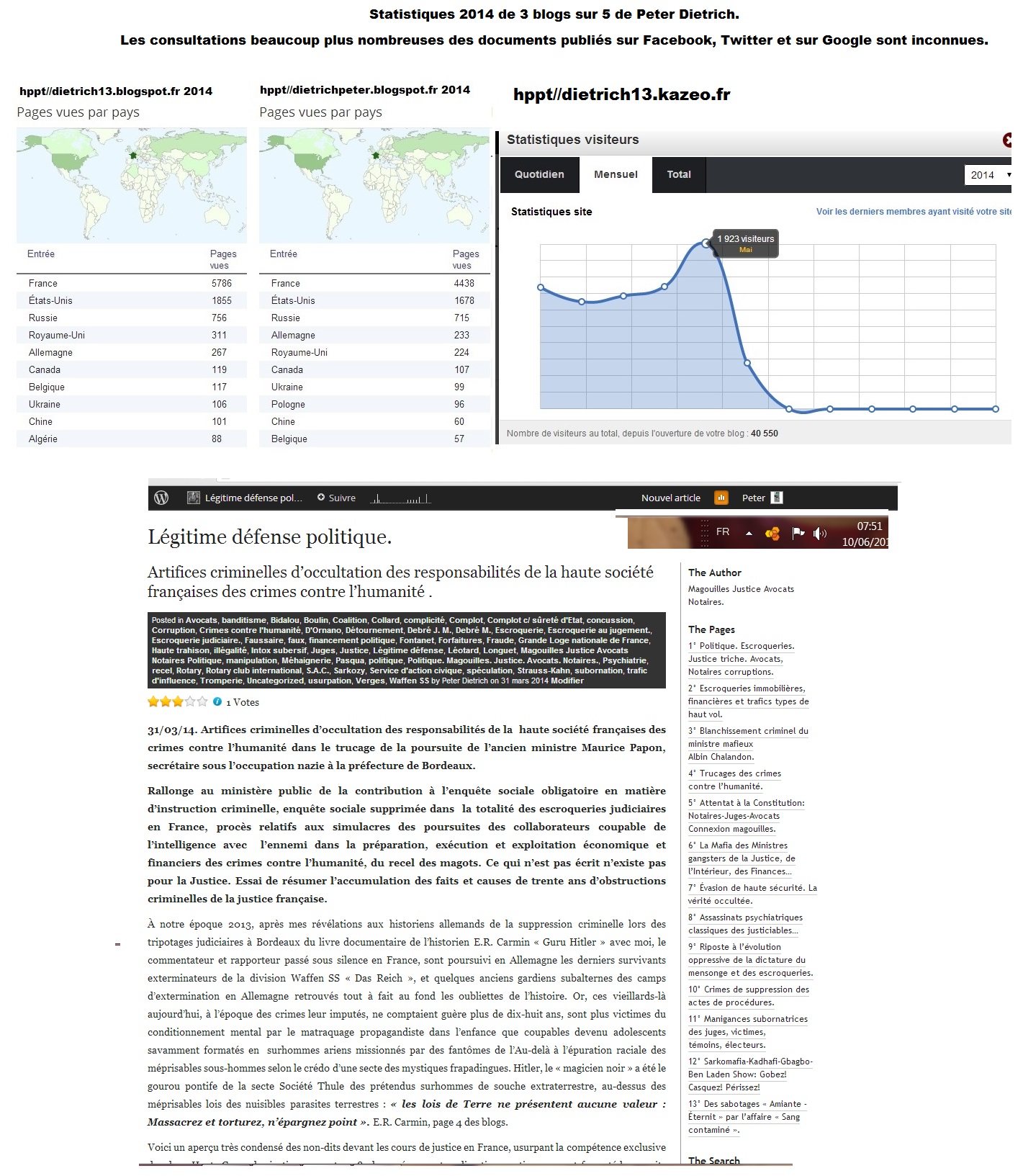 Depuis plusieurs années déjà, sur les huit différents blogs du juriste DEA, (sciences pénales, criminologie), Peter Dietrich s’instruisent de dizaines de milliers universitaires, juristes, juges et procureurs, victimes et leurs avocats de la Chine, en passant par l’Afrique, l’Amérique, l’Océanie jusqu’en Island. Ces blogs contiennent des constructions, argumentaires juridiques et bibliographies universellement applicables aux escroqueries de haute vole et leurs escroqueries judiciaires pour s’assurer l’impunité, (page 2), des preuves irréfutées par des juridictions saisies, de ces pratiques, notamment dans les trucages des poursuites des crimes contre l’humanité. (Page 4). À l’heure actuelle, les blogs subsistants à la censure insidieuse recueillent 50 consultants par jour.