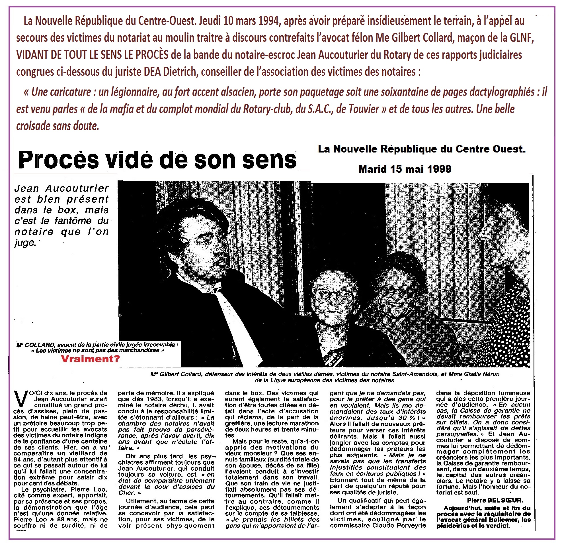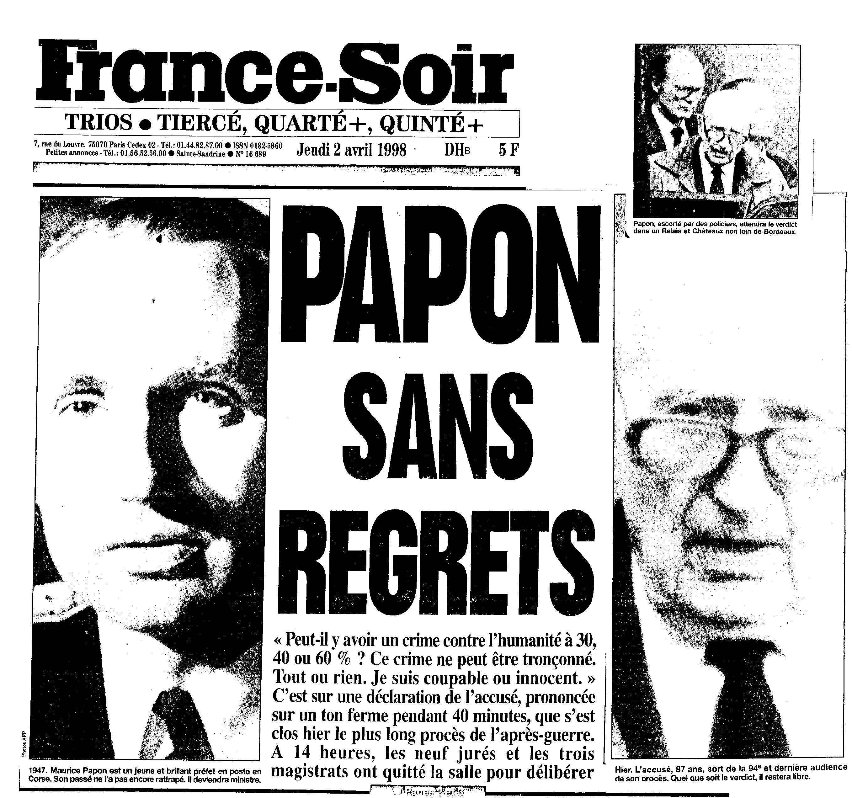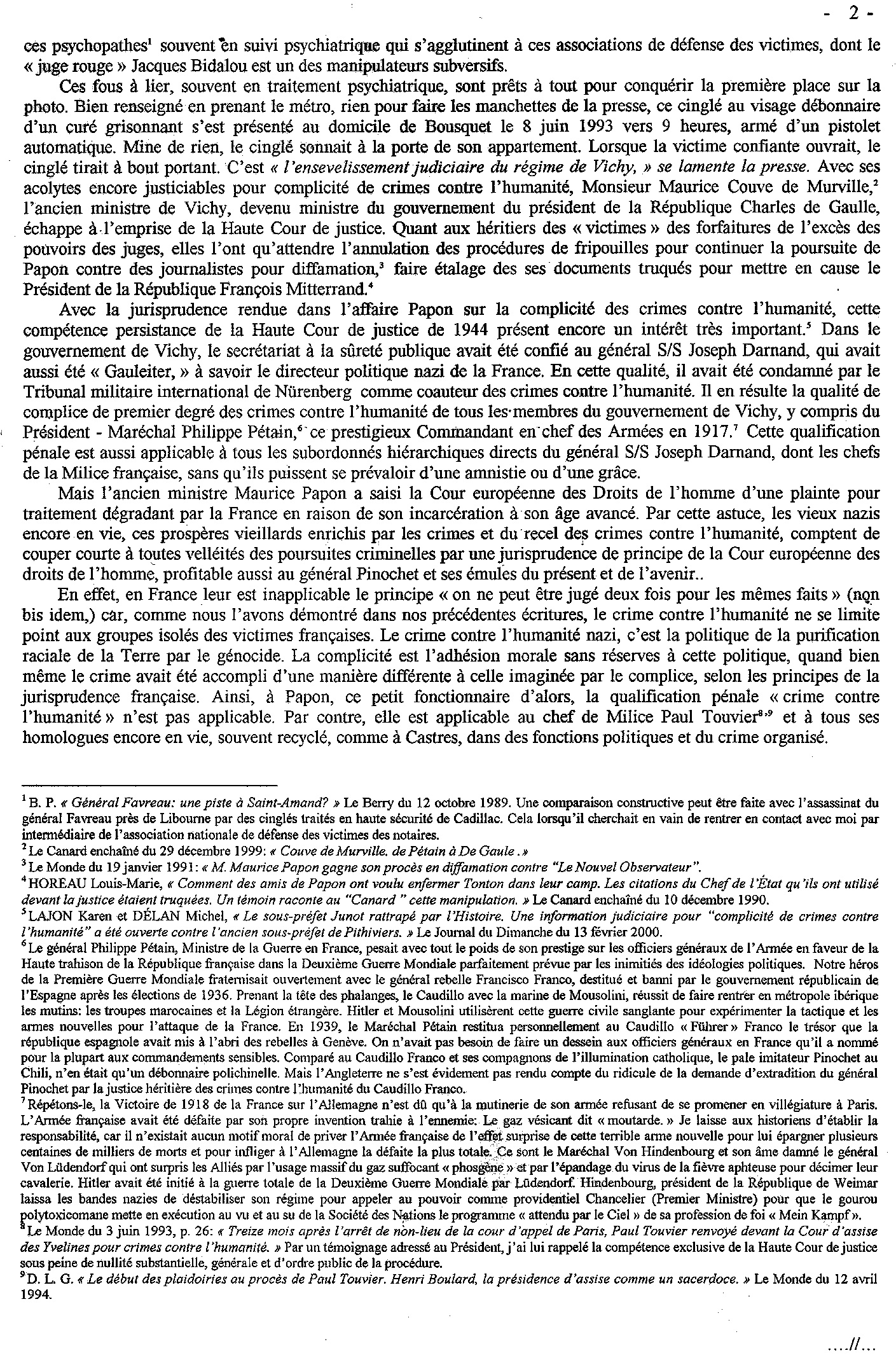 {Ces constatations de ce grand historien, s’appliquent à tous les procès systématiquement truqués en France à partir de 1944, du Maréchal Philippe Pétain, Laval…du jusqu’à nos jours des affaires Barbie (Lyon), Papon (Bordeaux et Paris), Touvier (Versailles), Brunner (Paris)… avec la participation criminelle des plus hautes autorités judiciaires et politiques, des institutions vénaux, corrompus de bas à l’haute étage, ainsi que les profiteurs de l’Europe et de l’ONU, ayant à leur tour escamoté avec constance les plaintes contre ces agissements criminels. D’autre part, l’aspect du sectarisme « religieux » de la direction du nazisme international, fait permuter en crimes contre l’humanité les qualification pénales en France de la haute trahison, du complot, de maintes crimes de guerre et même du droit commun telles que le détournement des fonds publics, des escroqueries, trafic d’influence, corruption, spoliations… manipulation de l’opinion publique par des infractions ravageuses de la presse exposées sur la page 11 des blogs}.
