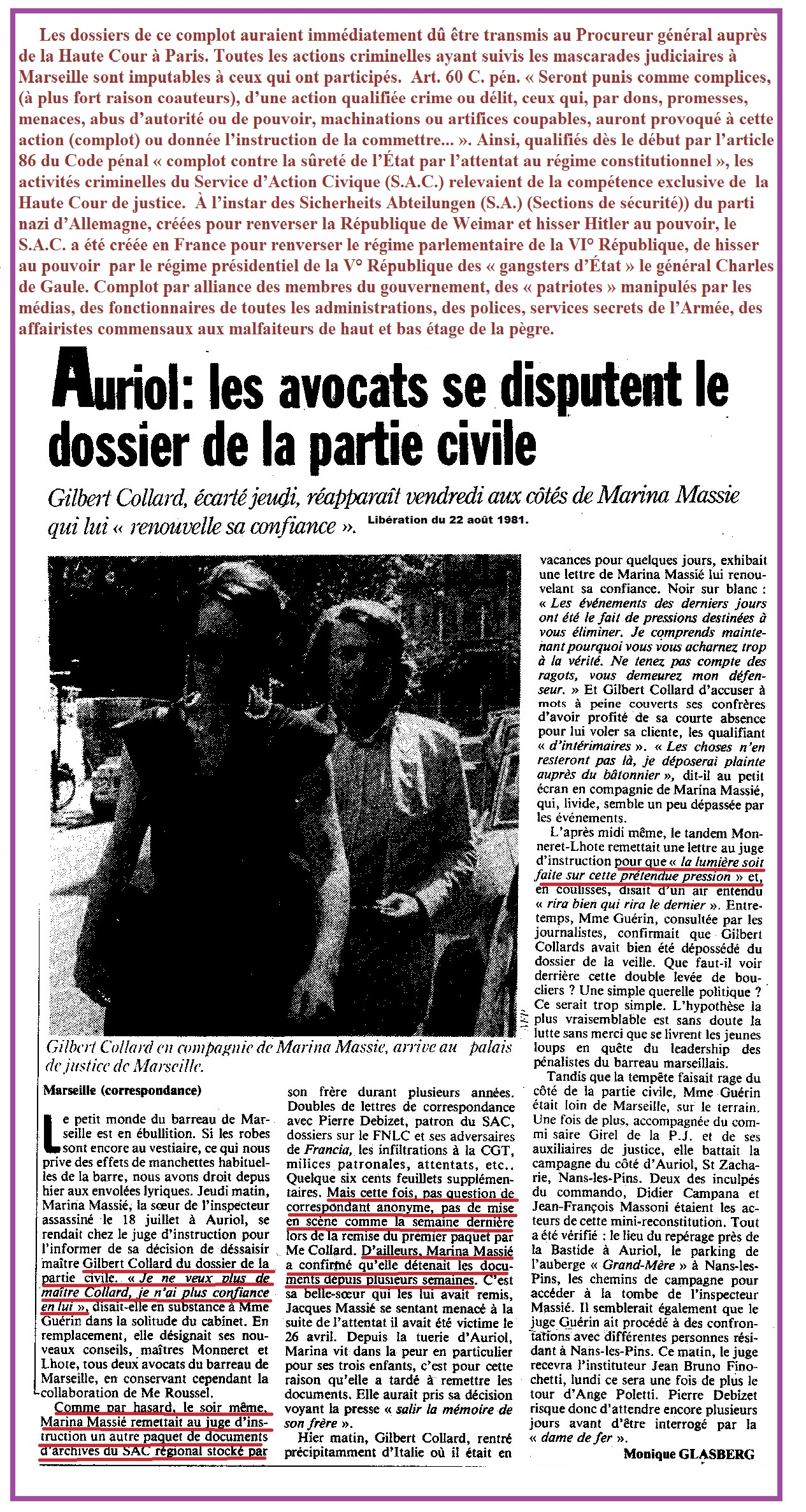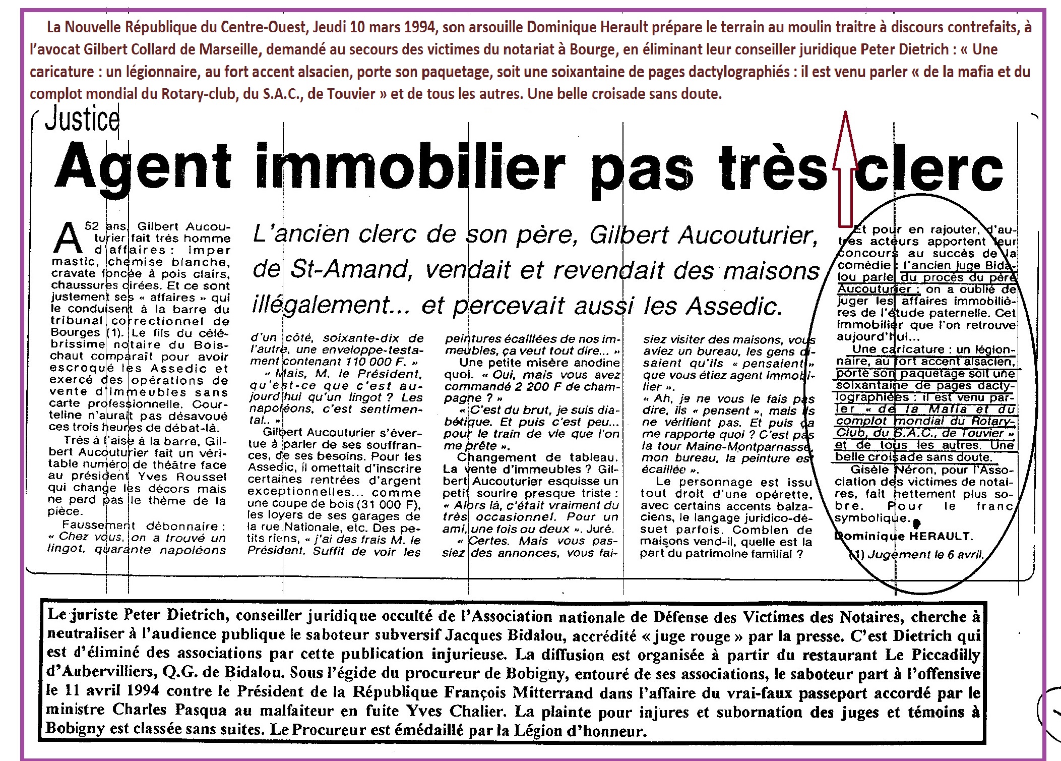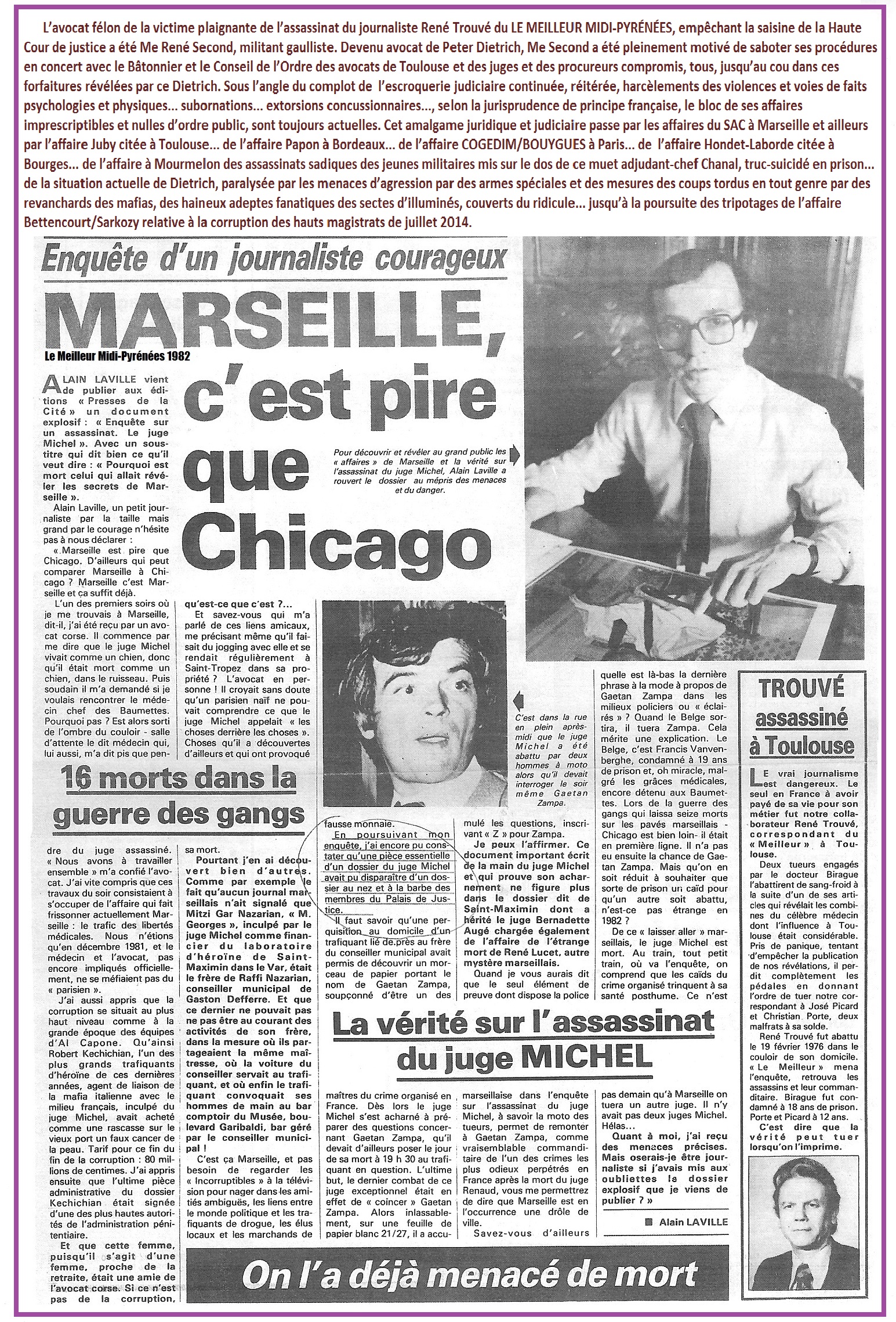 L’assassinat du juge François Renaud, comme plus tard d’autres assassinats, comme celui du Juge Pierre Michel à Marseille, rentre dans le cadre juridiquement indivisible du complot historique contre la sûreté de l’État par une coalition des fonctionnaires criminels, concertant contre les lois et contre l’exécution des lois, selon de la terminologie du Code pénal applicable à la totalité des affaires du grand banditisme du Service d’Action civique avec ses proxénètes et de la French connexion du trafic de drogue, manipulés par le « Gestapo Müller ». À Lyon, six juges d’instruction successifs ont soutiré l’affaire de l’assassinat du juge Renaud de la Haute Cour de justice par des ordonnances de non-lieu parfaitement illégales, ne rentrant pas dans leur compétence judiciaire. La Cour de cassation, ayant supprimé par des falsifications d’écritures les interventions détaillées du juriste calé Peter Dietrich, enterrait définitivement l’affaire de l’assassinat du juge d’instruction François Renaud, notoirement instigué par des ministres. Les redoutables stigmates de Peter Dietrich ont été parfaitement connus par tous les protagonistes et leurs complices des sociétés et sectes aux actions secrètes.