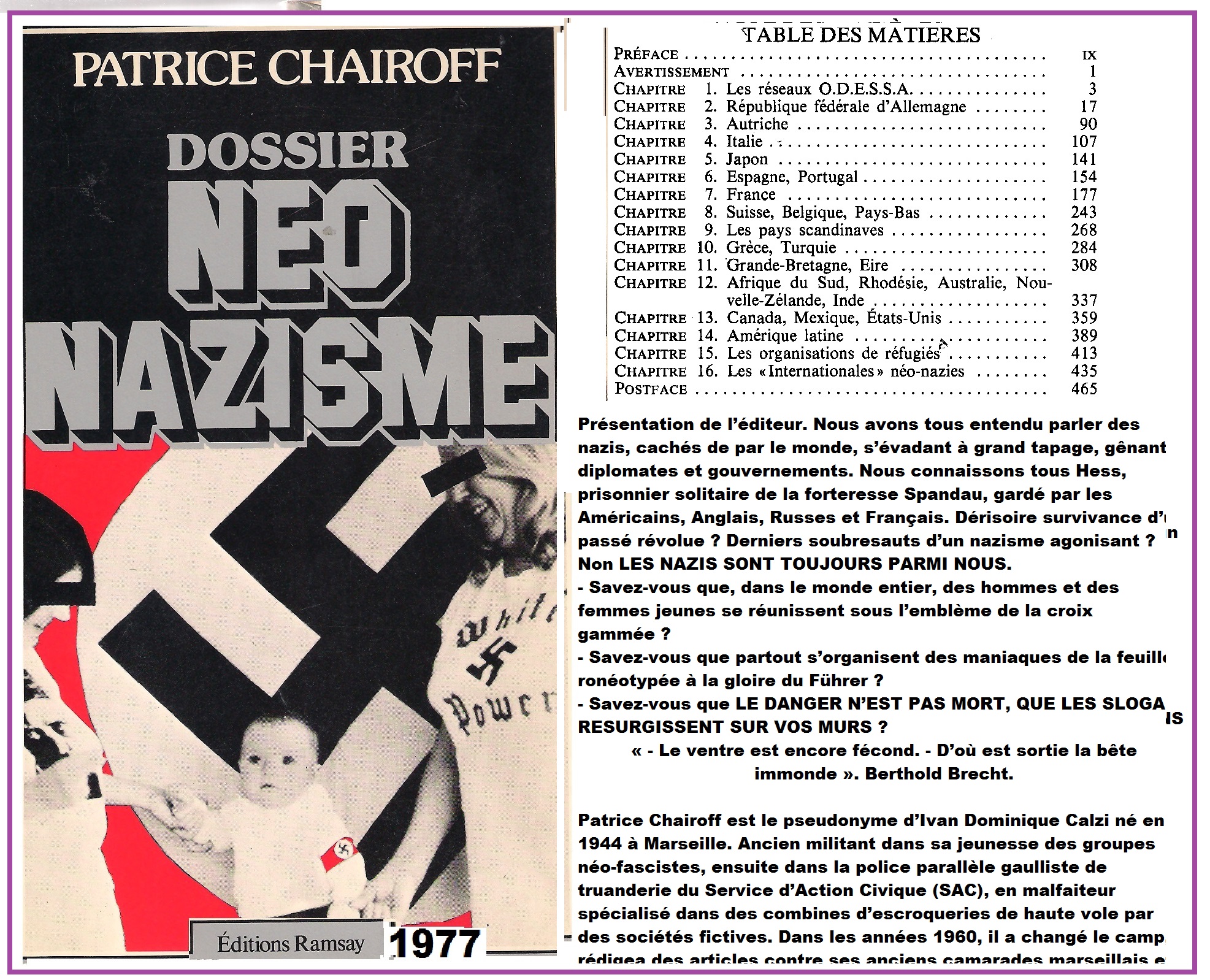 Le problème de ce livre et des autres achetés, c’est que les services secrets de l’armée m’ont manœuvré dans les universités de droit pour que ce soit moi qui je dévoile en 1981 les secrets de la Deuxième Guerre mondiale aux juridictions nationales et internationales. J’ai été freiné par des arrestations illégales, séquestrations, tortures, l’exactions fiscales, mon expropriation jusqu’aux slips. La soutenance d’une thèse de doctorat m’a été refusée, alors que mon professeur de droit de l’université Panthéon Sorbonne de Paris est mobilisé par des gangsters à coups de millions pour me ridiculiser par sa simple présence devant la presse au parfum au tribunal correctionnel de Paris. Les médias occultaient ma science rapportée contradictoirement aux interventions publiques. Ma avec mes publications congrues sur le Web des vrais secrets de la Deuxième Guerre mondiale, mon prestige international ne cessez d’augmenter. Maintenant, je vois apparaître des publications purifiées des secrets de la Deuxième Guerre mondiale de tout ce que j’ai publié et déjà rapporté à l’ONU, des embellissements de l’histoire, même par un professeur de l’université Panthéon Sorbonne, un de ceux qui me redoutent comme un épouvantail. Pourquoi me refuser le livre de ce docte journaliste, alors que je prépare un nouvel exposé pour l’ONU ? Blog dietrich13.com;