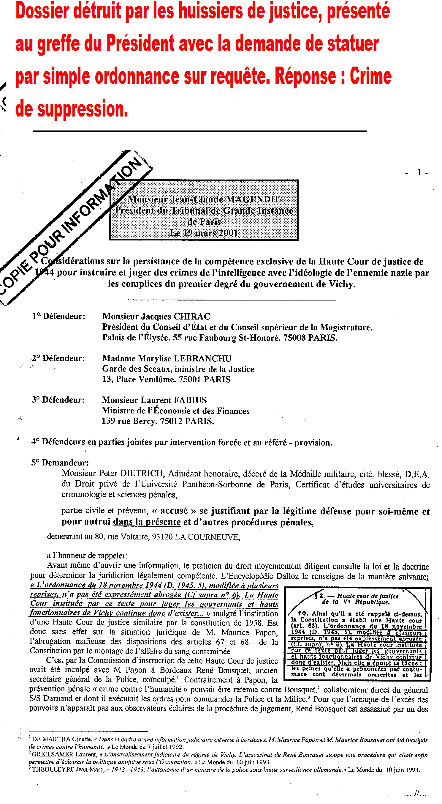 {Répétons les exposés escamotés par les juridictions saisis : selon la prophétie des visionnaires hallucinés de la secte de l’Ordre Thule d’avant-Hitler, le rédempteur de l‘accélération de l’Histoire’, la victoire de la race aryenne par la conflagration apocalyptique de la ‘Crépuscule des dieux’ wagnérienne, purificatrice par le feu de la Terre des sous-hommes, se produira qu’à la Troisième Guerre mondiale. Avec ces mythes pris au sérieux aujourd’hui encore en France par certains magistrats, voilà maintenant donc dépasser les qualifications pénales de complicité par instigation, par provocation, par aide et assistance… et celle du recel des crimes contre l’humanité. Depuis 1944, la justice française se trouve sans équivoque en présence de la qualification pénale ‘tentative de crimes contre l’humanité’, dont qualification ‘complicité’ qui s’applique la magistrature française, comme s’est encore démontré dans les récentes ‘apothéoses des clowns’ grand spectacle devant la Cour fantoche de justice de la République, les Assises à Bordeaux, Lyon, Paris et Versailles et pour s’achever par l’enterrement cérémonieux devant le décorum de l’Assemblée plénière de la Cour de cassation}.
