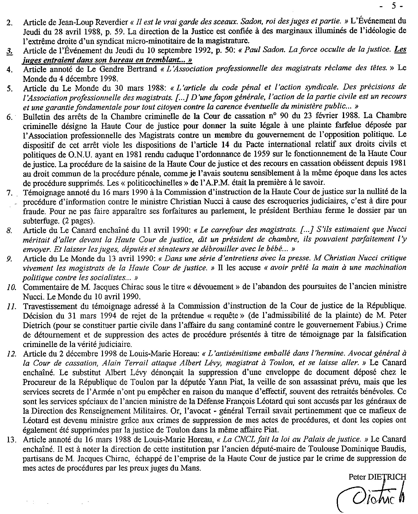 A la demande d’un râleur mécontent, transmission aux autorités compétentes du fichier joint de l’e-mail, complété par des documentés significatifs, annotés et déjà produits, contradictoire et non réfutés, à mainte reprise dans des différentes procédures citées, dont l’article annoté « DIETRCH JUSQU’AU BOUT DE SES IDEES ».