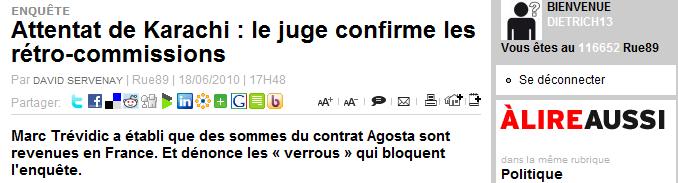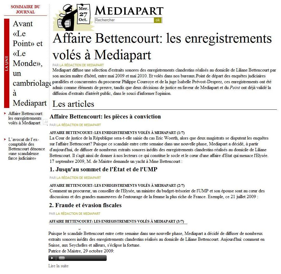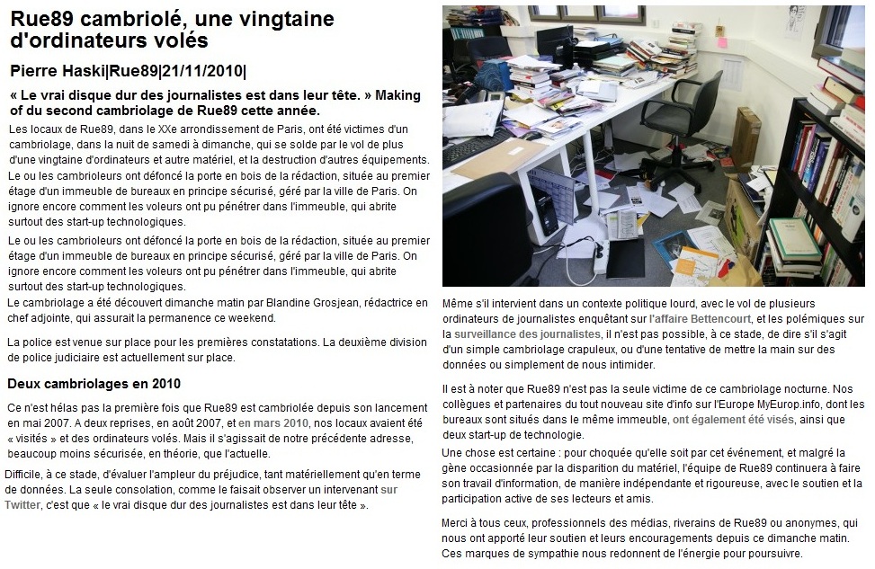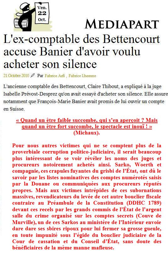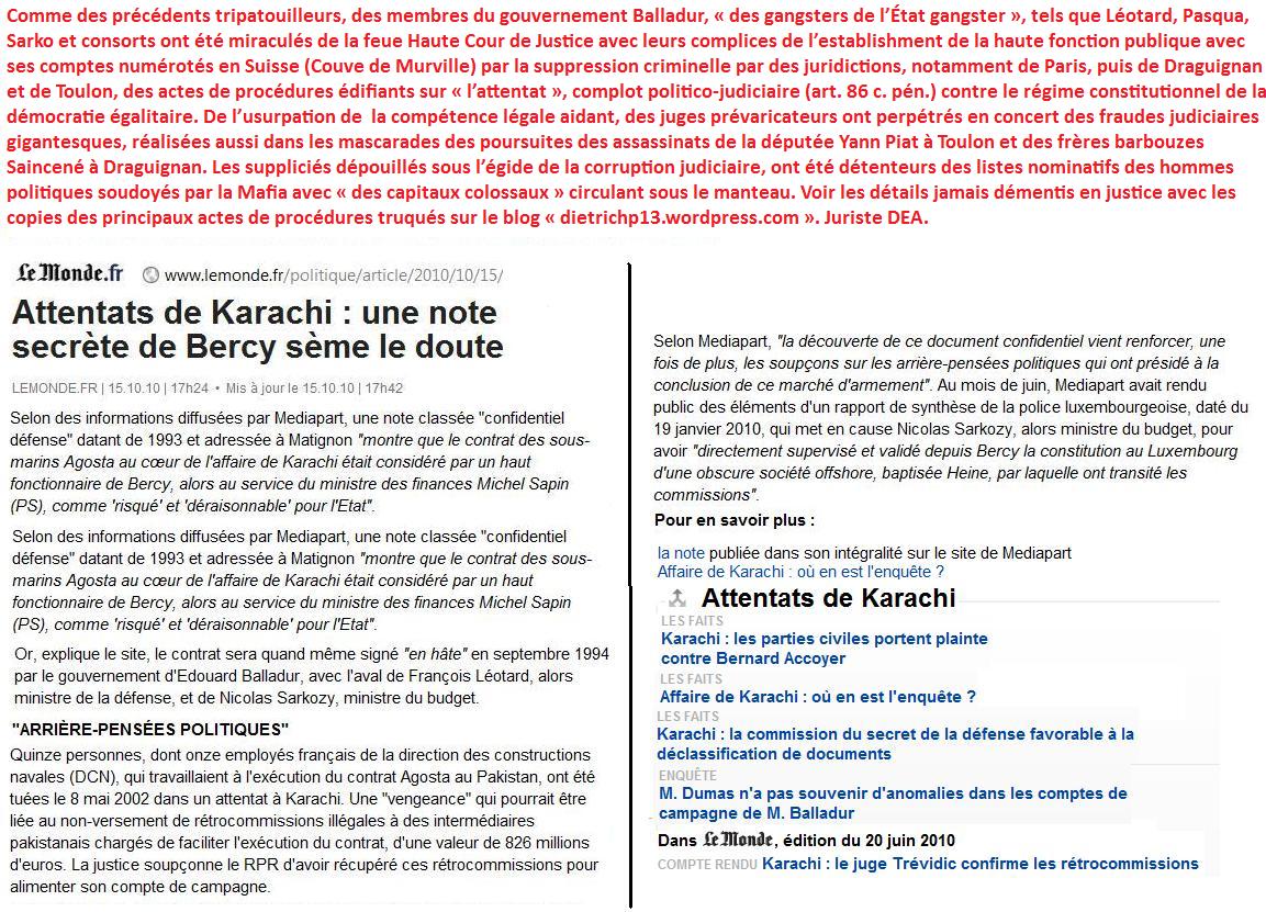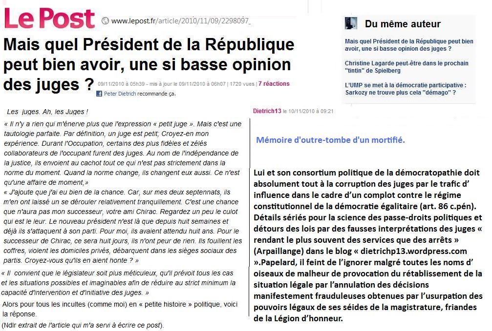 Publié le 11 juin 2010 dans Rue89 sous l’article « Sarkozy off : » un journaliste de Rue89 mis en examen. Plus que « la justice pourrie » (Charasse) est ridicule, plus elle impose dans la manipulation de l’opinion des crédules gogo spectateurs aux mémoires écourtés par le bombardement des scoops et de gags niais. Dans toutes les grandes affaires des chevaliers d’industrie, des escrocs et trafiquants de haute vole qui ont défrayées les chroniques judiciaires, il a été révélé sans équivoque des recels des capitaux faramineux, non seulement par des hommes politiques miraculés par le trucage de la justice, mais encore par des magistrats miraculés par une annulation de complaisance des écoutes téléphoniques des rats fourrés de l’égout judiciaire de la Cass « rendant plus souvent des services que des arrêts » (Arpaillange). Qui aujourd’hui peut nous garantir que ce journaliste émergeant de la masse des laudateurs, pommadins et brosses à luire besogneux des mafieux du régime, n’est pas persécuté par des receleurs de la magistrature soudoyées par des gangsters, trafiquants, proxénètes… ? Ceux qui orchestrent dans notre régime constitutionnel une justice à deux vitesses, à deux poids et à deux mesures sont qualifiés par « la branche mortifiée de notre droit pénal » coalition de fonctionnaires (criminels) concertant contre l’application des droits fondamentaux de la République, garantis par la Constitution, notamment par son préambule qui est la Déclaration des droits de l’homme et du citoyen de 1789, comme je l’ai sérié dans mes blogs. Ce ne sont pas les profanes qui dénoncent ces infâmes magouilles par leur vocabulaire truculent qui portent atteinte à l’autorité de la justice ou à l’honneur des crapules qui la truquent à tour de bras pour gagner une médaille, un avancement ou des « casuels ». Ce sont leurs décisions truquées qui en portent atteinte, a déjà précisé le professeur en droit et des Hautes études Serge Fuster, le défunt président de Chambre de la Cour d’appel de Versailles (Casamayor). Les noms d’oiseaux des victimes excédées, « ordures ou tas d’ordures », pour ne citer que le général S. Albagli, ne sont que des qualifications pertinentes, forfaitures desquels la loi exige la dégradation civique. Notre droit fondamental n’autorise pas seulement, elle incite même l’action directe par la légitime défense politique. Elle invite tout citoyen éclairé d’intervenir dans ces procédures truquées par une constitution de partie civile clarificatrice et de protestation et pour laquelle il a un intérêt direct et personnel, comme l’a revendiqué même l’Association Professionnelle de Magistrats dans un contentieux insignifiant. Et si cela se révèle inefficace, alors ces citoyens responsables sont autorisés par la constitution, en toute impunité légale, d’aller encore beaucoup plus loin…