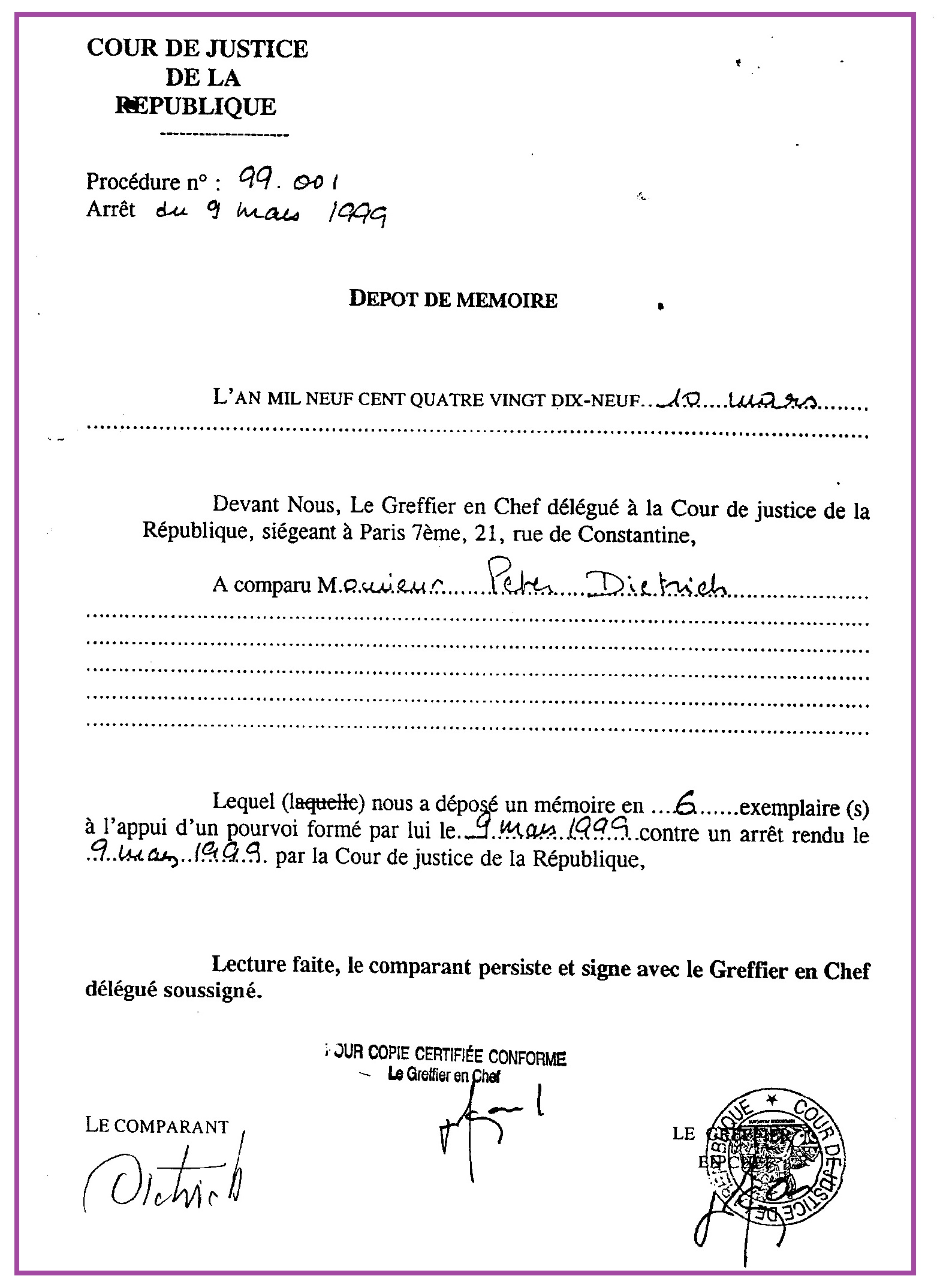 Pour me régler le compte par l’élimination en coulisse à la Cour fantoche de justice de la République, les premiers juges faussaires et tripoteurs, ces « bouffons de la République » (Arpaillange), ont débuté leurs offices de mascarades par des forfaitures aberrantes. Puis, pour faire dormir en paix ces authentiques escrocs de la chose judiciaire, le nouveau Code pénal de 2011 dépénalise furtivement le complot exposé, procédait encore à d’autres dépénalisations des forfaitures dont j’ai été victime avec la France toute entière. Par le crime en bande organisé, sont rendues illégalement caduques, la plupart de mes incontestables constructions juridiques étayées des références jurisprudentielles et doctrinales. (P. 4. La Haute Cour de justice de 1944 n’a cependant pas pu être gommée dans la loi après mon intervention par le déclinatoire congru de compétence. Elle demeure toujours légalement compétente pour poursuivre et juger en exclusivité l’incrimination légale « intelligence avec l’ennemi » dans l’organisation de longue main des crimes contre l’humanité).