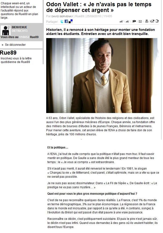 Mercredi 20 octobre 2010 à l’attention des associations de défense des victimes. Votre philosophie est largement dépassée dans l’esprit de l’intelligentsia contemporaine, tout juste bon à la crétinisation du menu peuple. Le 26 au 30/04/10 sur France Culture, dans ses cours sur les droits fondamentaux de la République, le professeur Pierre Jean Wallon du Collège de France, précisait que les principes de la devise de la République « Liberté, Égalité, Fraternité » sont des notions « obsolètes » qui ne se sont jamais concrétisés dans les faits politiques. Vous pouvez réécouter mainte cours de philosophie sur « France culture. com. »