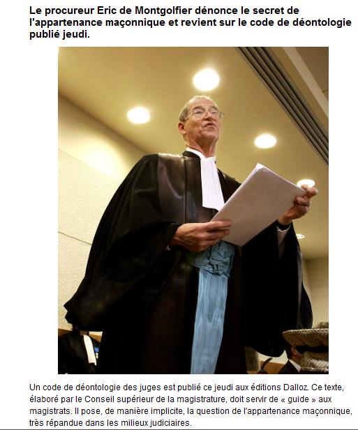 Publié le 11 juin 2010 dans « rue89 » au sujet de la revendication du procureur Montgolfier du dévoilement des magistrats Franc-maçon. Bonjours les dégâts. Sur la page 1 de mes blogs est sommairement exposée la philosophie perverse des sociétés secrètes menant la politique au dessus de la tête des peuples. Leurs vitrines de noyautage des membres mafieux des gouvernements « gangsters » et de leurs acolytes criminels dits « grand commis de l’État, sont entre autres, les Rotary, Lyons et Kiwanis-clubs interconnectées, crées par une des Franc-maçonneries. Or, en ce qui concerne le complot du Rotary, mes preuves régulièrement enregistrées ont été supprimées avec le plaignant dans plusieurs procédures le concernant avec son excroissance, le feu SAC, rentré en clandestinité. Leur « complot contre la sûreté de l’État par l’attentat contre son régime constitutionnel de la démocratie égalitaire », (art 86 c.pén.) je l’ai dénoncé régulièrement à la justice en revendiquant leur envoie groupé, conformément à la loi, (voir les détails dans mon blog) devant la Haute Cour de justice avec leurs réseaux criminels des polices parallèles. Résultat : La Haute Cour de justice fut sabordée par une escroquerie politico-judiciaire phénoménale exposé dans mon blog, au moment où elle aurait dû fonctionner par la ratification par la France du Pacte relatif aux droits civiles et politique de l’ONU. Les complices des « Gangsters de l’État gangster », les rats fourrés de l’égout judiciaire des faussaires de la Cass ne peuvent plus être inquiété par la justice, par la nouvelle Cour « fantoche » de Justice de la République ». Tel qu’elle a été constituée par des manipulations criminelles, elle est aussi politiquement illégitime et constitutionnellement illégale qu’à l’été la législation de Vichy, avais-je revendiquée dans des procédures également supprimées. Mais, il y a des Franc-maçonneries et des Franc-maçonneries ! Il ne faudrait pas toutes mettre dans le même sac sans en avoir des preuves de leurs nuisances respectives. Tant que la situation légale n’est pas rétablie, la magistrature toute entière doit être considérée comme une authentique association de malfaiteurs au sens juridique et criminologique du terme.