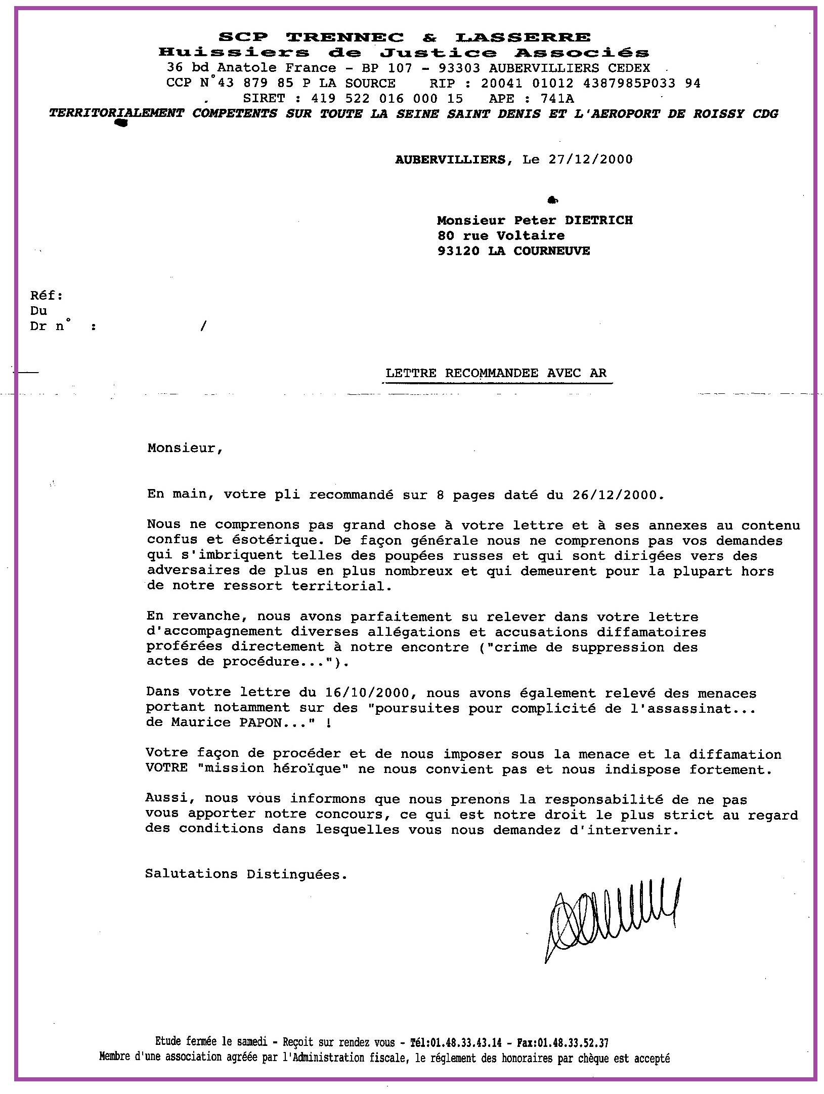 Monsieur Pierre-Marie Adam, c’est vraiment dommage que l’extrême droit, vos protégés, n’ont pas mis leurs menaces à l’exécution, car vous l’avez cherché en m’écrasant dans les palais de justice avec ma science, notamment dans l’affaire Papon en 1981. Naturellement, pour vous autres, il était bien plus rentable de spolier la Banque de France de son dépôt d’or que de faire appliquer vos fumeux principes à la Libération. Ce que je viens d’écrire à votre frère maudit, applique encore plus à vous autres, avec vos magistrats vénaux auquel j’ai livré tous mes armes vendues pour des avancements, des pots-de-vin, des décorations de la Légion d’honneur.