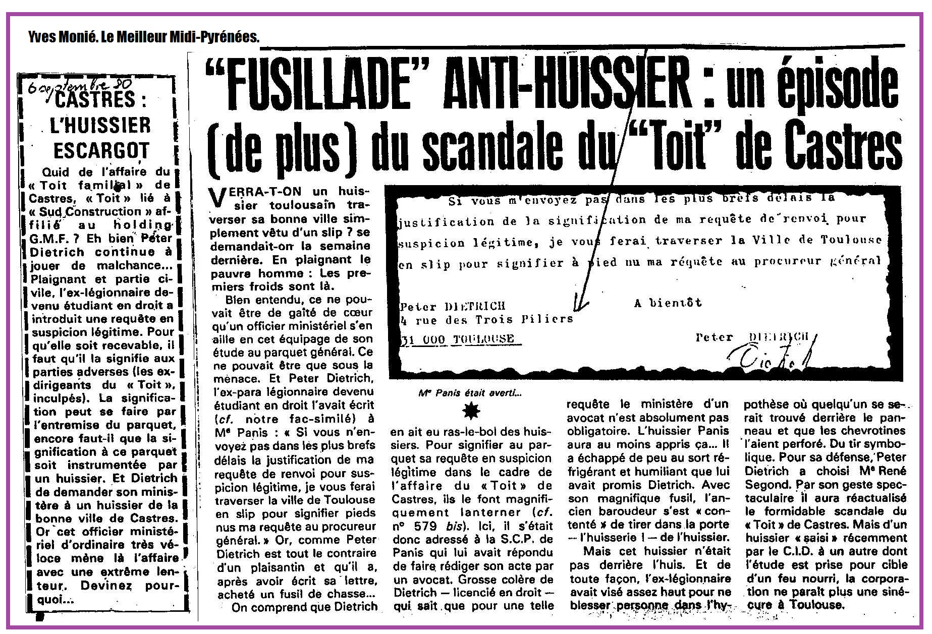 Arrivé à l’université de droit de Toulouse, je fus connecté par la SEF-SRPJ de Remusat à Toulouse au journaliste Yves Monié. Ancien barbouze du SAC lui aussi, à la fin connaisseuse des ficelles ayant succédé au journaliste du Le Meilleur. En raison de ses investigations sur des affaires du grand banditisme des truands du SAC, assassiné par les escarpes marseillais du distingué Dr Birague. Des Grands Malins m’ont comblé des ouvrages de l’Éditeur Alain Moreau, notamment du plus édifiant d’Alain Jaubert : « D …come Drogue » cité. Les mentors me suggéraient de galvaniser toute mon énergie à l’étude du droit pénal et de sa procédure. C’est cette discipline académique seulement autoriserait de résoudre le problème de la French-connexion dirigée au plus haut niveau par des ministres. Le but à atteindre : la saisine de la Haute Cour de Justice en application des qualifications de l’article 86 c. pén 1806, pénalisant le complot contre la sûreté de l’État par des attentats à son régime constitutionnel de la démocratie égalitaire, et, contre ses intérêts économiques essentiels, du blanchissant des énormes capitaux sales des trafics de drogue par le biais des investissements dans des magouilles immobiliers associées aux grenouillages des marchés truqués des Travaux publics.