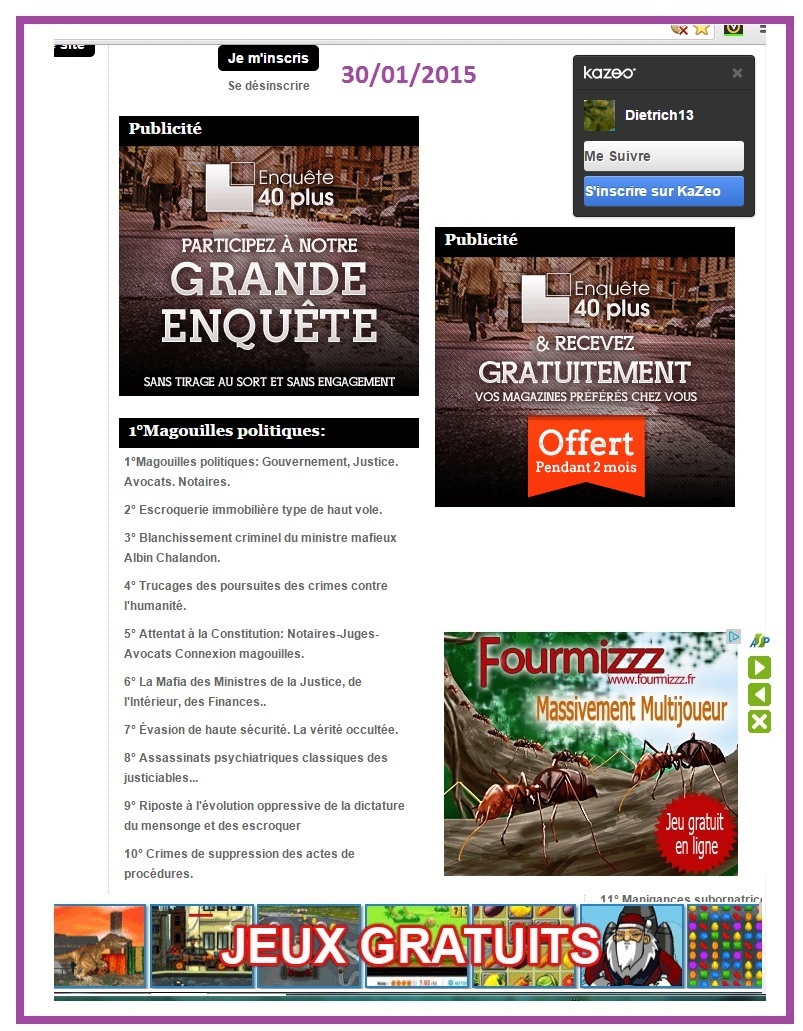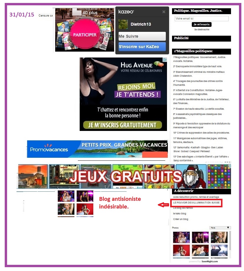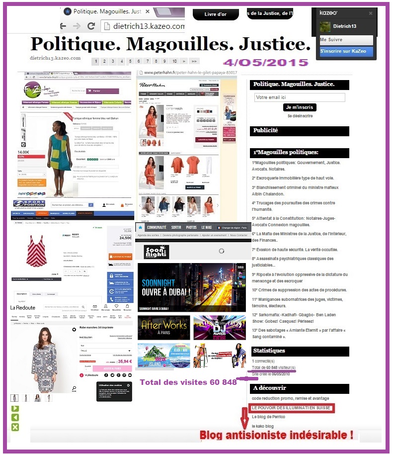 Depuis des années, je me plaigne en vain en justice de l’ « expropriation » de mon blog dietrich13.kazeo.com aux fins de manipulation de la politique politicienne par la désinformation et l’intox déviant ma philosophie sur des domaines politiques qui me sont franchement odieux, tout en réalisant des substantielles bénéfices par une publicité non consentie, diffusé par l’abus de mon image de marque dans le monde entier.