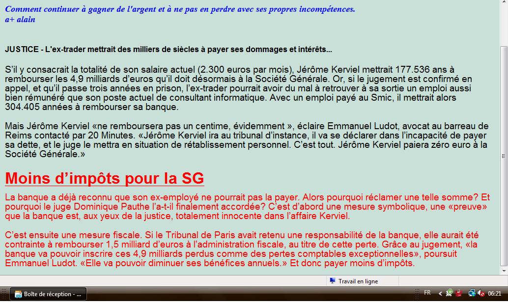 Bonjour. Votre Bouygues, partie de pas grande chose, avec son criminel acolyte de ministre déprédateur Chalandon, s’est hissé en deux décennies au rang des premières fortunes de la France. Sa progéniture domine les principaux médias pour « faire ou défaire les hommes politiques ». Leur grand ami dans leur fief à Neuilly est Sarko. « L’opinion public c’est moi », se vantait à juste raison Papa avec sa télé. « L’honorabilité, ça se paye. » Aujourd’hui, sa smala compte encore d’acquérir par des millions le journal Le Monde super-endetté. C’est par ce biais de la corruption, subornation et trafique d’influence, même perdant avec les médias déficitaires, ils réalisent par le biais d’autres sociétés des superbénéfices par l’attribution des marchés et autres passe-droits, achètent les procureurs et les juges, paralysent ou orientent la justice. N’en parlons pas des avocats qui vous vendront au premier venant. Faites attention à votre santé, car ces gusses-là mettront tout en œuvre pour vous faire sortir des gondes par des chicanes inimaginables, vous rendre barjo pour de bon et vous livreront à leurs auxiliaires de la psychiatrie. Leurs techniciens s’y connaissent en manipulation psychologique. Contre la déprime, la course à pied de cinq à dix kilomètres chers aux paras, est un excellent remède. Et, par le cerveau ainsi oxygéné tous les jours, ils vous arriveront dans le calme de bonnes idées. Si quelqu’un conteste mes observations, envoyez-le à la lecture de mes blogs. Et surtout gardez-vous des justiciers insinuants dont vous avez reçu un E-mail en réplique. Bien à vous.