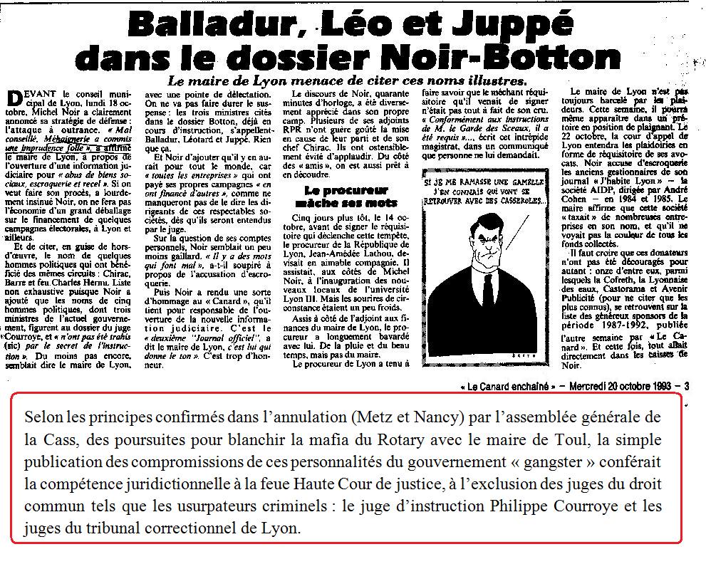 Les points essentiels : pour se livrer à des forfaitures partisanes exposées, des juges d’instruction aiguillonnés par les délices de la corruption impunie, sous l’égide de la Cour de cassation, usurpaient allégrement leurs compétences légales des feux articles 678 et suivants du Code de procédure pénale et de l’article 68 de la Constitution, déférant la compétence exclusive à la feue Haute Cour de justice sabordée. À cette époque sinistrée des escroqueries de haute vole, présidant à Paris une association de défense des victimes de l’immobilier, le général Samy Albagli me fit part de la forfaiture du doyen des juges d’instruction du TGI de Paris (Rotary) pour rédiger l’exposé et la publication dans le périodique « Assistance ». Pour qu’il soit donné la suite légale –« le renvoi sans délais » à la Cass‑ à la plainte avec constitution de partie civile contre des escroqueries immobilières et judiciaires, il se voyait exiger, illégalement, selon la jurisprudence de principe de la Cass, une substantielle caution dissuasive en parfaite violation des dispositions précitées.