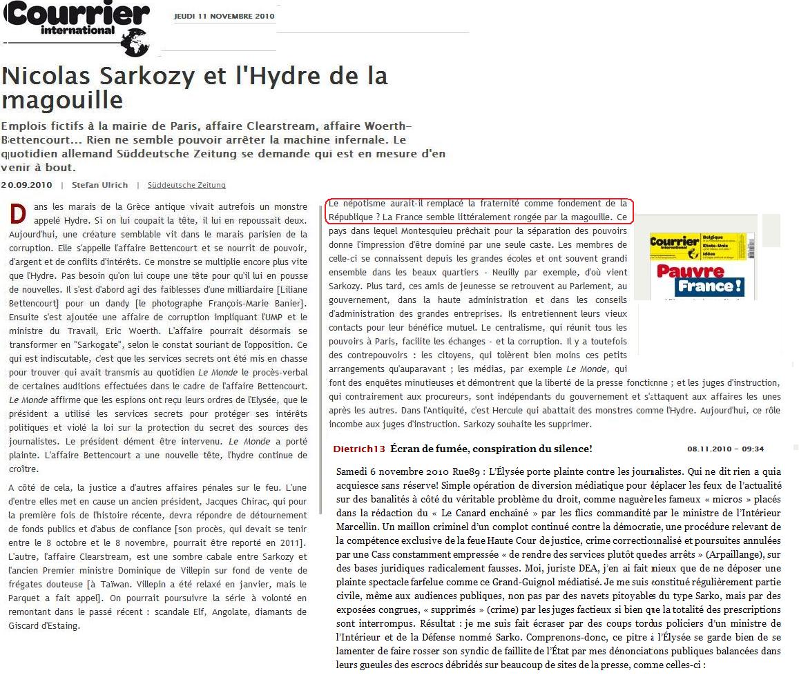 « Ne perdons pas de vue la loi en chantier par laquelle la mafia de la haute finance compte de faire censures arbitrairement le Net par les sbires de leur matabiche-loufiat Sarko-les-pots-de vins. Ces criminels de haute volée ne supporte pas de voire démonter sur internet leurs attentats contre la démocratie et les intérêts économiques et financières de l’État par leurs réseaux de corrompus corrupteurs. Rappelons à ces moralisateurs, 70% des flux monétaire dans le monde est incontrôlable. Une grande partie provient du trafic de la drogue. Chaque année, quarante milliards de dollars sont blanchis par les moyens de participations croisées, en étoile, circulaire… dans des sociétés fictives ou d’écran ou des banques situées dans des républiques cocotiers ou bananières, et, ensuite lavé plus blanc investis dans des sociétés qui finances ou téléstarisés les hommes vendus et partis politiques receleuses un peu en dessus la table, et beaucoup en dessous la table. Ceux qui payent commandent. Leur corruption généralisée aboutit à ce que lois ne représente plus la volonté générale, mais la volonté particulière de la canaille aux belles manières. Argumentaires judiciairement acquiescés sans réserve, entre autres par Pasqua, Sarko… Strauss-Kahn… : p. 4, blog dietrich13.wordpress.com ».