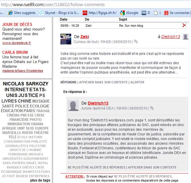 Réplique du 10 juin 2010 au ministre de la Justice, publiée sur Rue89. Bonjour les dégâts. Encore une plaisanterie de notre sinistre de l’injustice. Comme je l’ai amplement démontré, en relatant quelques détails sur mes blogs avec la reproduction des décisions truquées par des falsifications grossières, les crimes de suppression d’actes de procédures, parfois avec l’assassinat de leurs auteurs, sont commandités par le gouvernement à « une coalition (criminelle) de fonctionnaires concertant contre les lois » fondamentaux de la République. Ses zélotes de la magistrature, ses rats fourrés de l’égout judiciaire à la Cass, en sont récompensés par les plus hautes décorations, des avancements, sinécures… comme l’a déjà dénoncé, entre autres hautes personnalités crédibles, le professeur en droit Serge Fuster, magistrat (Casamayor). La seule chose qui s’impose en urgence est l’annulation dans l’intérêt de la loi (art. 620 c. pr. pén.), à la demande ce cette hypocrite démagogue mièvre, toutes les décisions manifestement frauduleuses reproduites sur mon blog, ensuite le rétablissement de la Haute Cour de justice sabordée par des escroqueries politico-judiciaires phénoménales enfin que les zélotes faussaires et truqueurs de la magistrature puissent être neutralisés et jugés comme en 1944 avec les membres du gouvernement, proxénète et trafiquants, complices et receleurs du crime organisé.