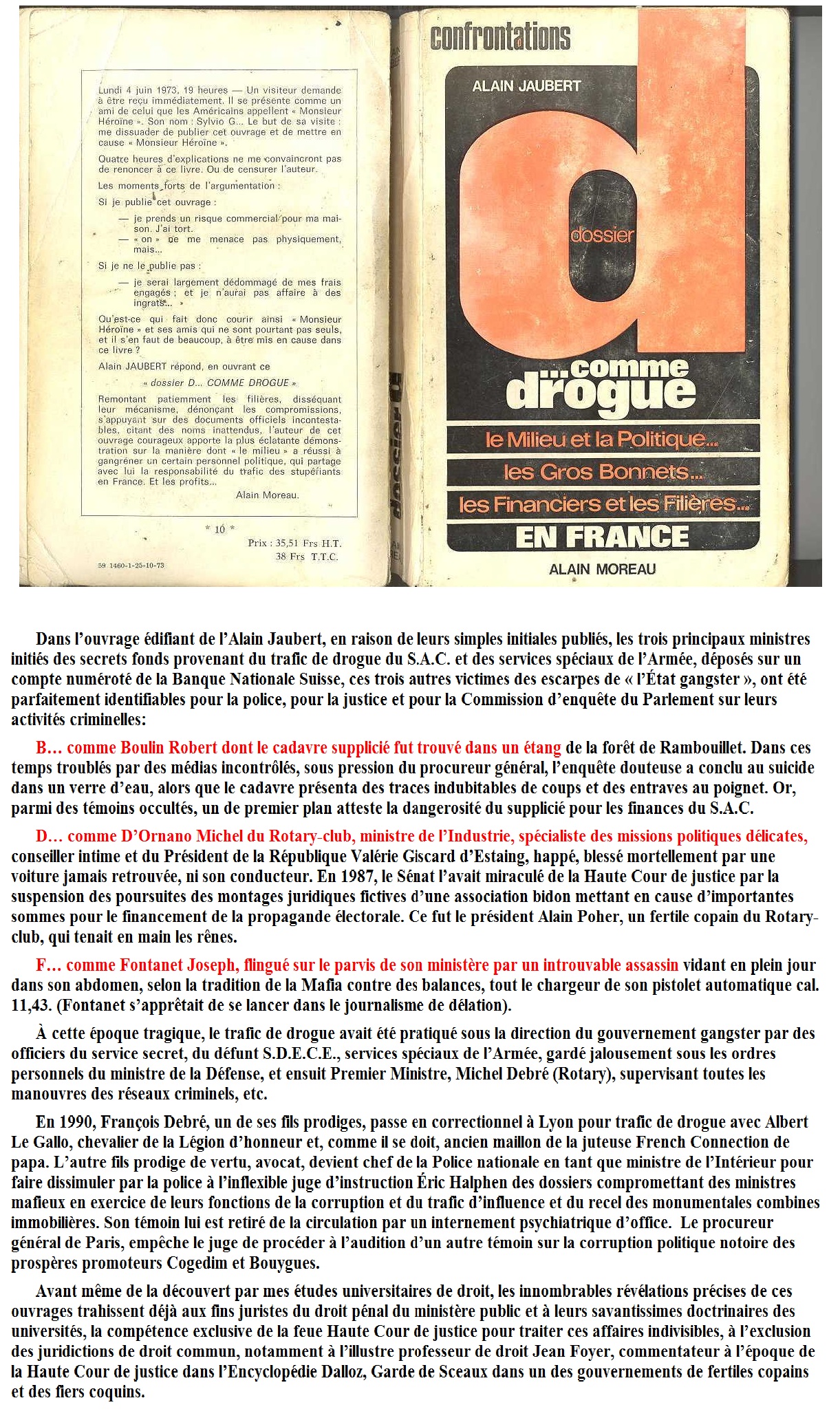2° Escroqueries financières, immobilière et trafics type de haute vole récompensés par des décorations de la Légion d’honneur, des avancements jusqu’au Conseil constitutionnel, des pots-de-vin des truands… » DcommeDrogue2