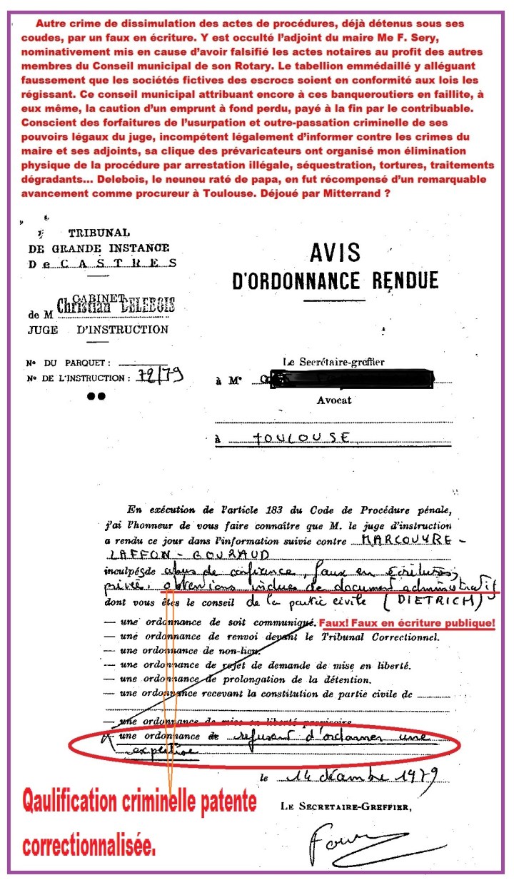 2° Escroqueries financières, immobilière et trafics type de haute vole récompensés par des décorations de la Légion d’honneur, des avancements jusqu’au Conseil constitutionnel, des pots-de-vin des truands… » Refus expertise Delebois