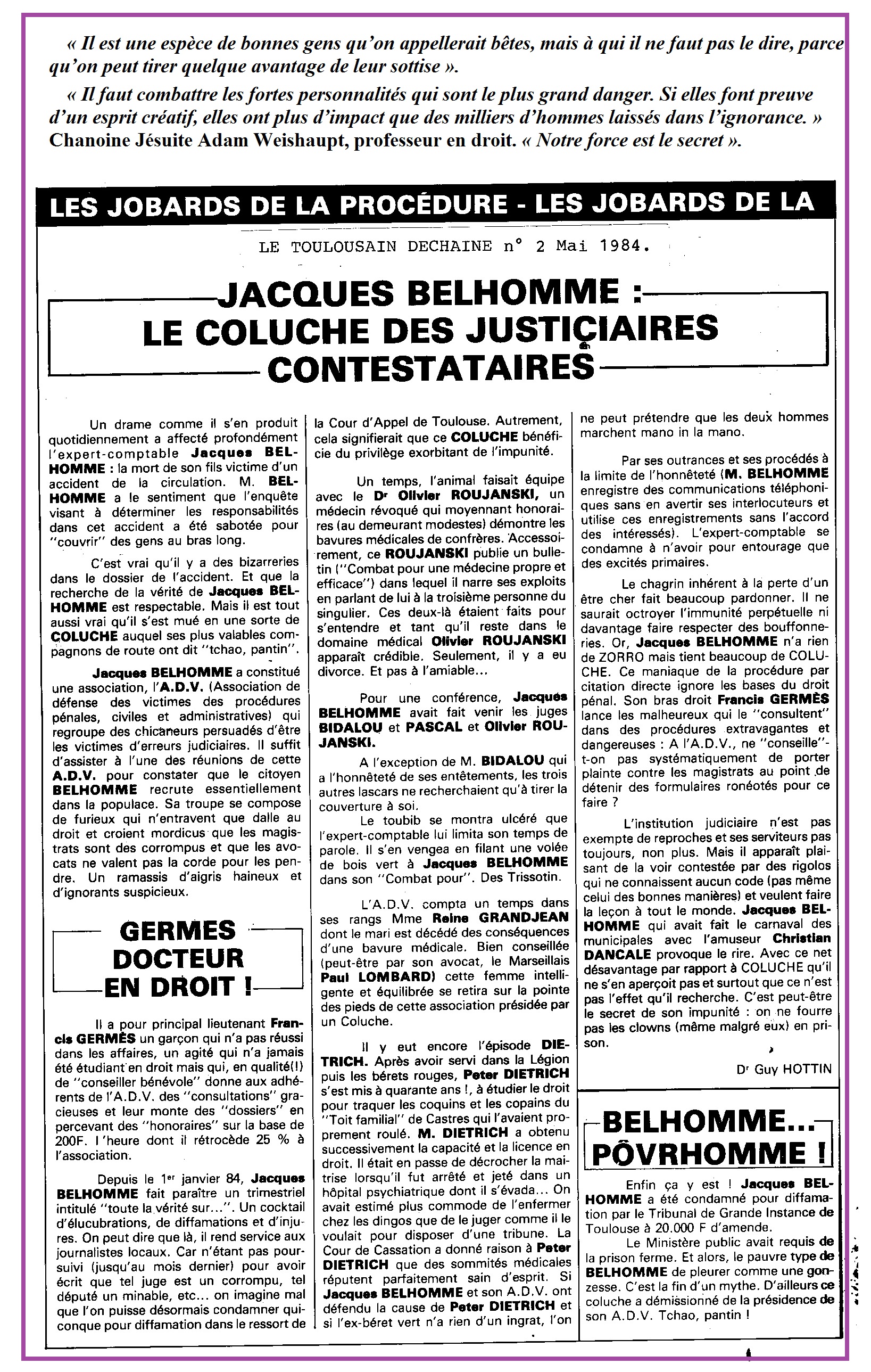 Le « juge rouge » Jacques Bidalou, insignifiant juge d’instance des plus médiocres, par un simulacre s’est fait suspendre de la magistrature pour me jouer le numéro de l’ami indéfectible dans ma lutte contre le complot contre la sûreté de l’État. Le « frère insinuant » m’a fait capter par l’expert-comptable Jacques Belhomme manipulé au suicide judiciaire, avec son Association de Défense des Victimes de la Justice. Avec le plus redoutable avocat félon Me Jacques Verges, largement financé pour la subversion par des bandits de l’étranger, le « juge rouge » Bidalou et son cercle des illuminés pervers, sous le « commandement du capitaine Jean-Édern Hallier avec son Idiot International, m’ont dévié de ma route : de l’intervention auprès du juge d’instruction Pierre Michel en détresse judiciaire, puis préventivement assassiné.