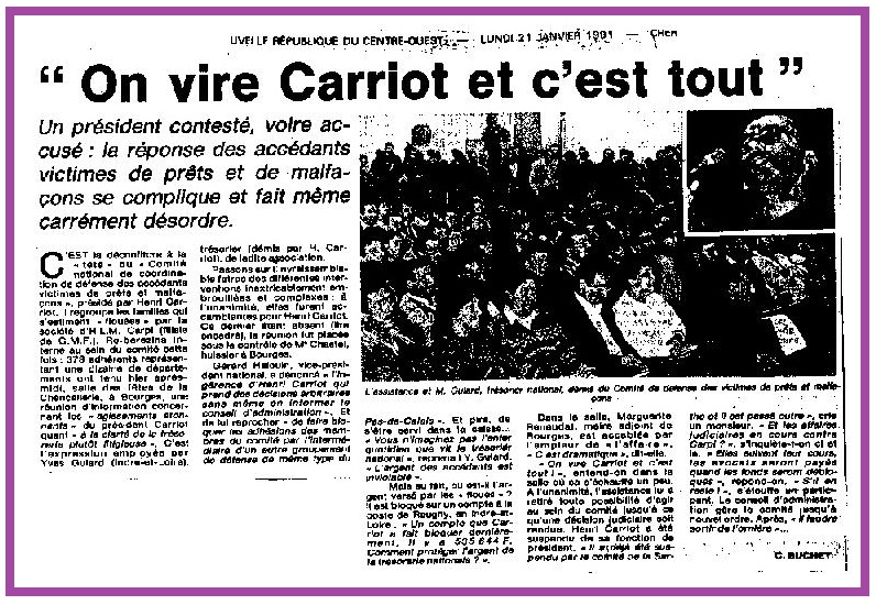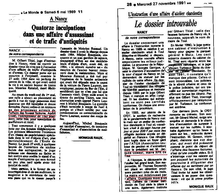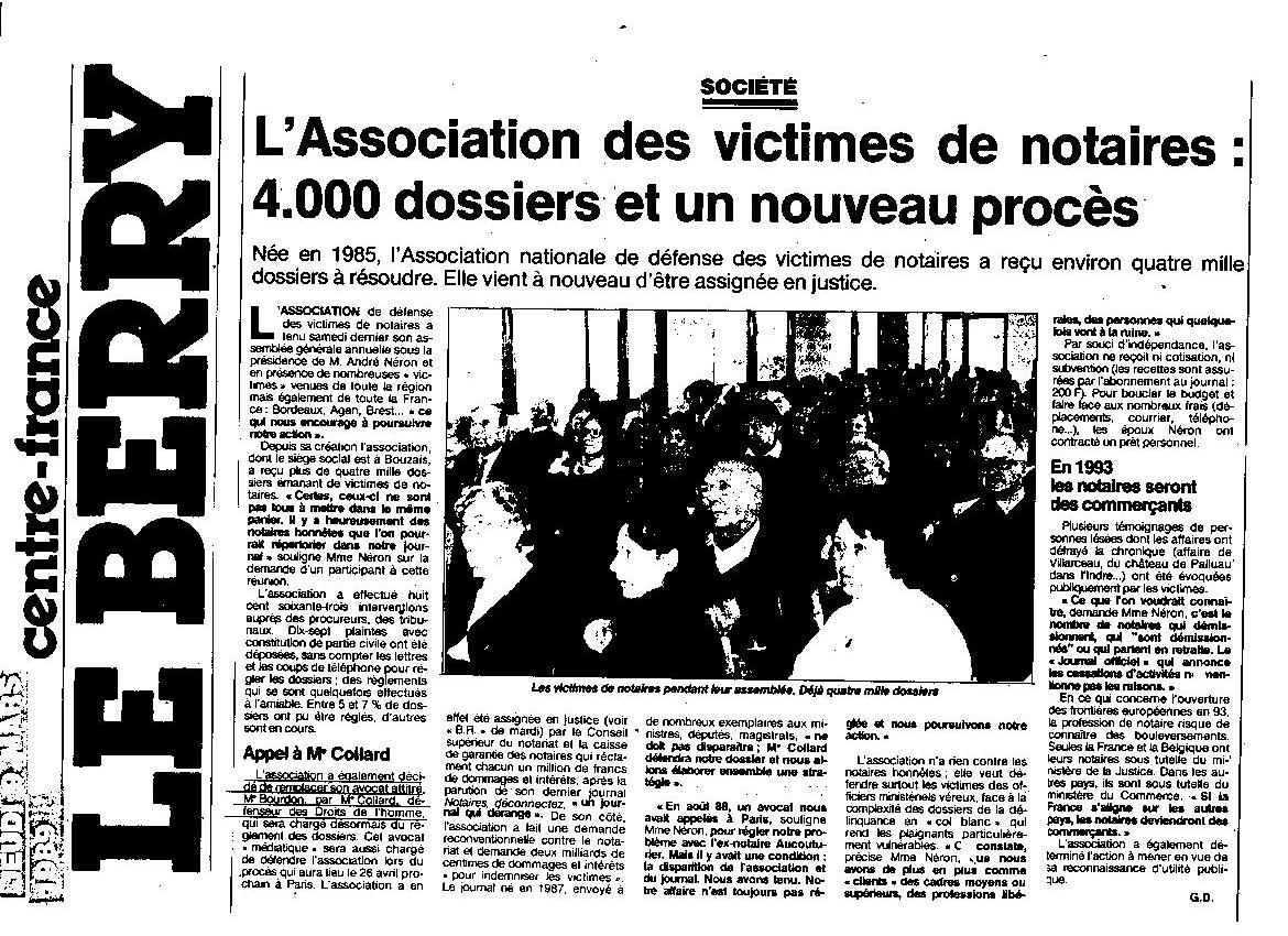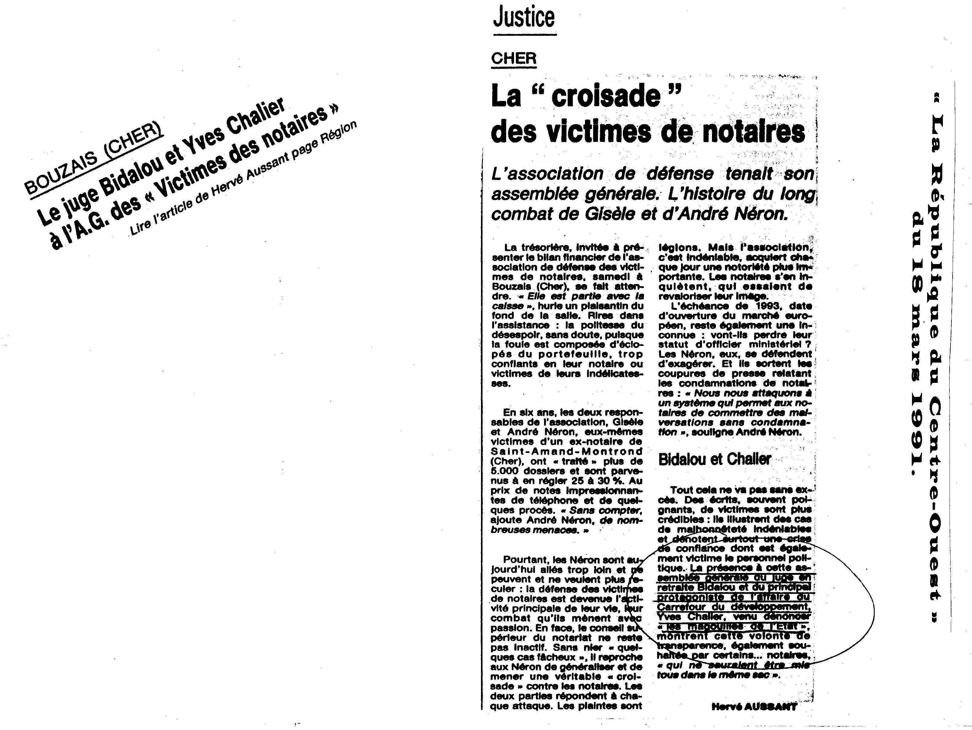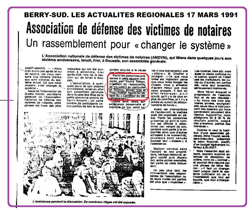 Le Notaire Aucouturier a été dénoncé par des victimes en 1981. Les rapports préliminaires 19 février 1982 et de la Police judiciaire, du 22 septembre 1982 de la Gendarmerie constatent ces escroqueries en bande organisée. Les bruits bien plus concordants que les rumeurs ayant produit l’annulation des poursuites du maire Gossot de Toul avec sa bande du Rotary, démontrent l’incompétence légale des juridictions de Bourges, en raison des compromissions notoires des magistrats de la cour.