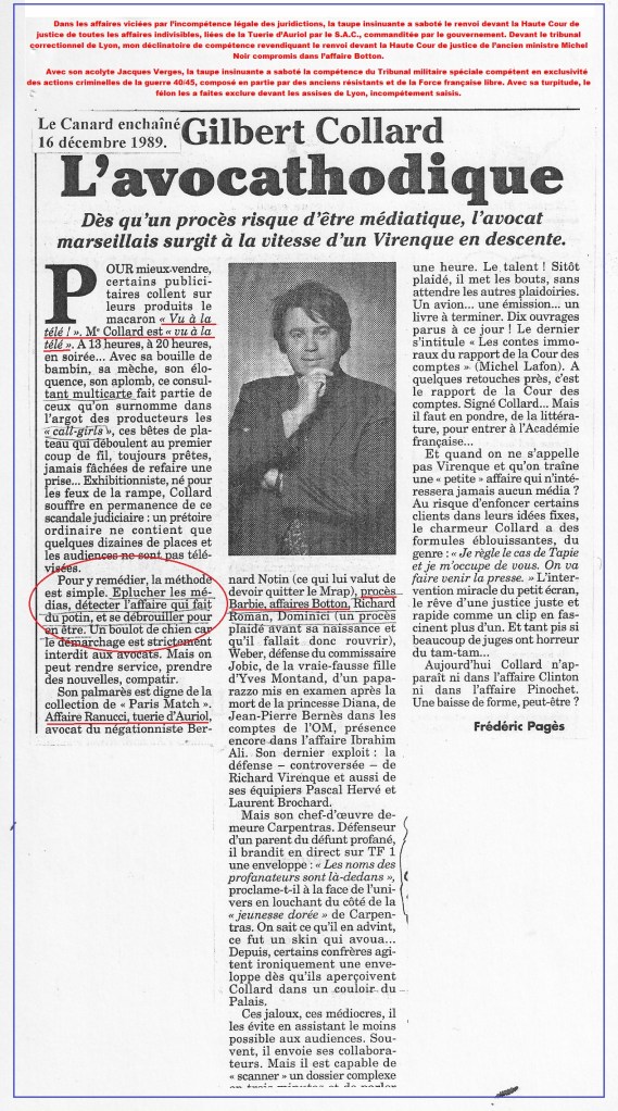 En fomentant mon arrestation illégale en 1980/81 à Toulouse, (avec l’affaire de la « tuerie d’Auriol), sabotée par Me Collard, cette conjuration des illuminés pervers, a réussi d’empêcher mes interventions salvatrices, de démasquer leurs turpitudes organisées par le régime des « gangster d’État ». l’avocat félon Gilbert Collard , Maçon de la GLNF avec son complice de Paris le Président Jean-Claude Magendie, membre du Conseil de surveillance du holding Lagadère, important propriétaire des médias avec Bouygues et Vivendi… qui starisaient leurs avocats attrape-nigauds.