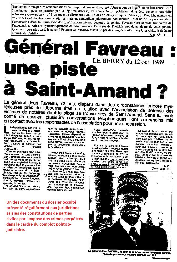 Maintenant, avec la présence comme conseiller du fameux Dietrich, les époux Néron sont devenus d’une importance politique primordiale. Le procès Aucouturier devant la Cour d’assises légalement incompétente, avec l’intervention avisée du juriste Dietrich, risquait déclencher un scandale national. Il fallait occulter aux adhérents de leur association la présence salvatrice de Dietrich, récupérer ces deux margoulins farauds dans la subversion contre le président de la République François Mitterrand. Il fallait assassiner en urgence le général Jean Favreau, qui a eu le malheur à la recherche de l’adjudant Dietrich, de téléphoner à cette association sous écoute intensive, disparaître les dossiers qu’il comptait confier à lui.