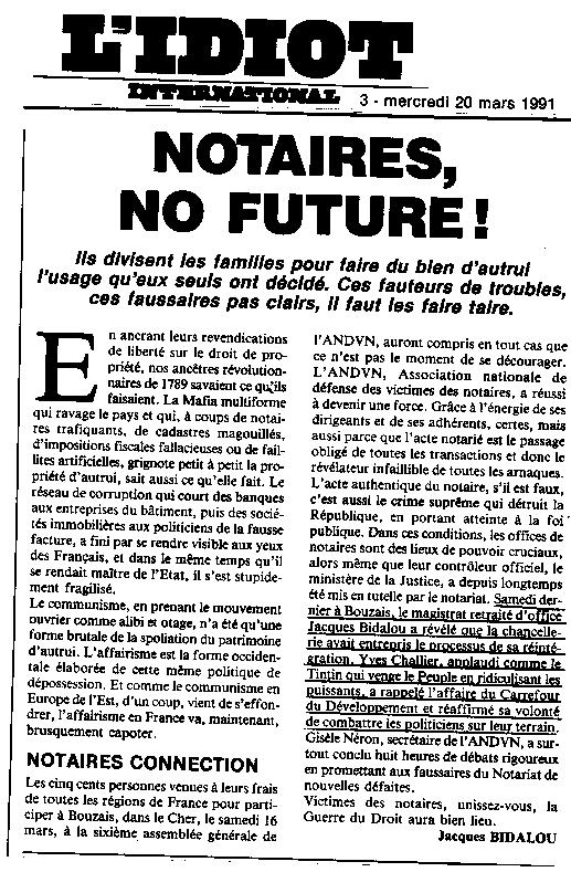 Le Premier ministre Charles Pasqua, après l’avoir formé par la Maffia au Brésil, fait adjoindre au « juge rouge » Bidalou, le lieutenant-colonel Yves Chalier, éminent spécialiste militaire en guerre psychologique, pour la manipulation des époux Néron. Flattez les imbéciles pour anéantir les élites ! à l’aide des calomnies injurieuses propagées contre le juriste Dietrich, simultanément à la médiatisation auprès des victimes du notaire Aucouturier les éminentes vertus de l’avocat star Gilbert Collard, les fils complices et receleurs du magot du notaire Aucouturier ont échappé à la justice, ainsi que leurs magistrats complices du Rotary club.