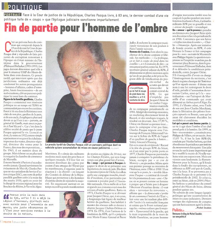 01 mai 2011 : Mise à jour page 6 sur le blanchissement judiciaire de Pasqua et des escroqueries judiciaires récompensée par 40 millions € de Tapie.