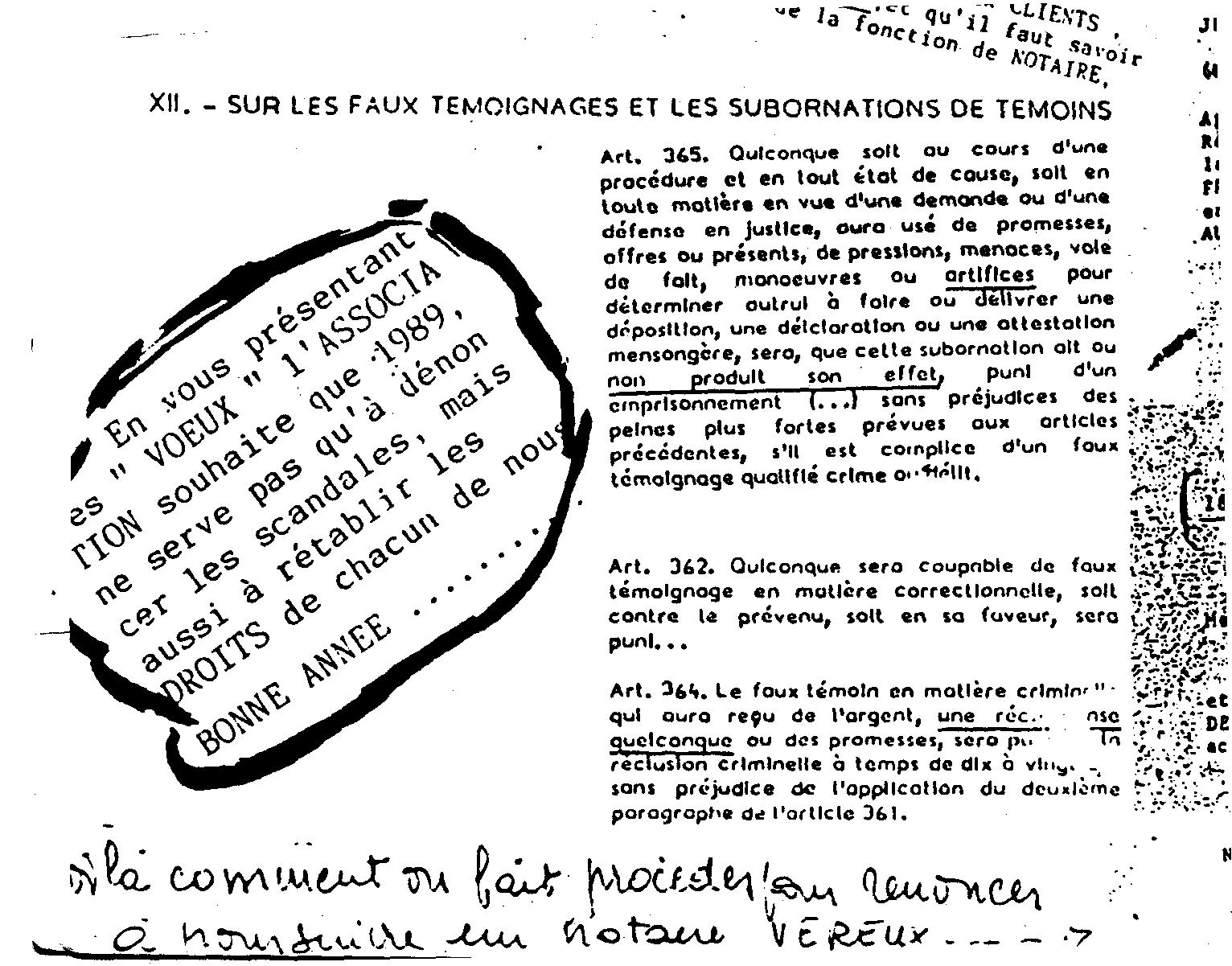 Pour contacter le juriste DEA décoré de la Médaille militaire, le général Jean Favreau, sans doute en initié de ses stigmates numérologique, commet l’imprudence de demander des renseignements au téléphone de l’association nationale de défense des victimes des notaires, mis sur l’écoute par le ministre de l’Intérieur Charles Pasqua. Peu après, le cadavre du général Jean Favreau est trouvé poignardé dans un canal, sa voiture contenant ses dossiers explosifs brûlés ; dossier sur les prédateurs du notariat qu’il comptait doute remettre à ce juriste d’attaque dissimulé par les Néron sauvés par lui.