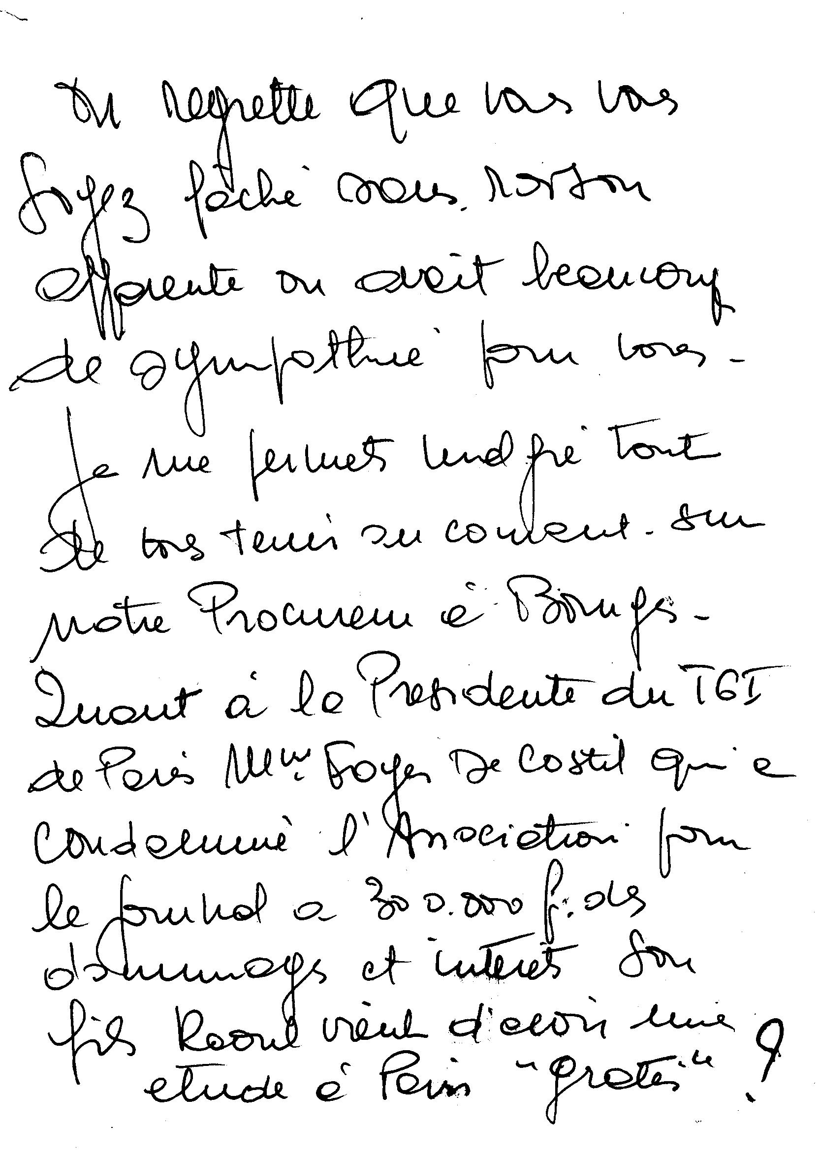 La secrétaire du greffe de Paris m’a fait comprendre que je n’obtienne pas la communication du jugement avant l’écoulement des délais de recours en appel par le ministère public. Il m’est donc rendu impossible pour longtemps de connaître les motifs exacts du jugement rejetant le déclinatoire de compétence et la justification d’un intérêt direct et personnel de ma constitution de partie civile.